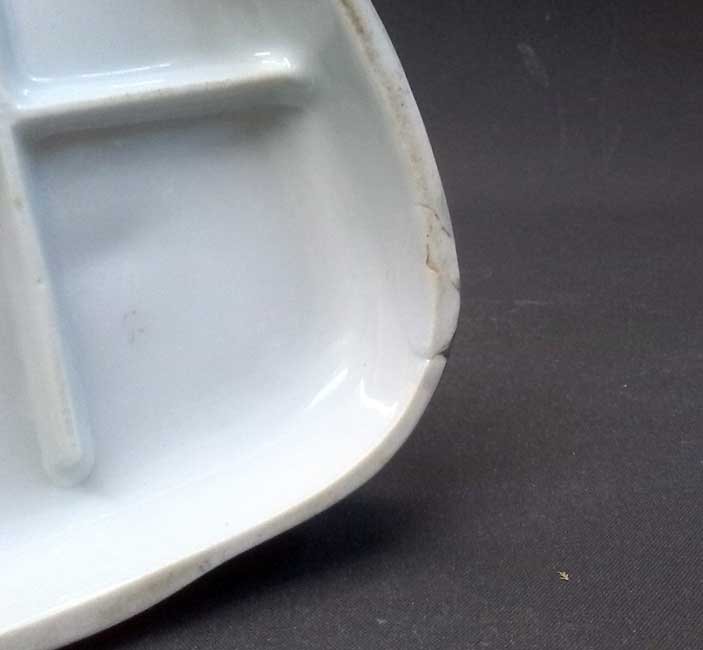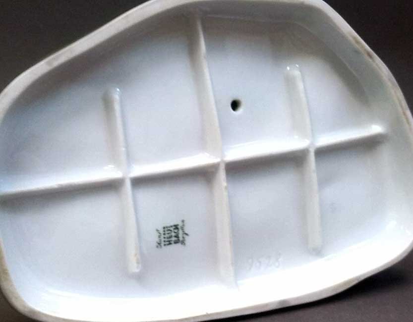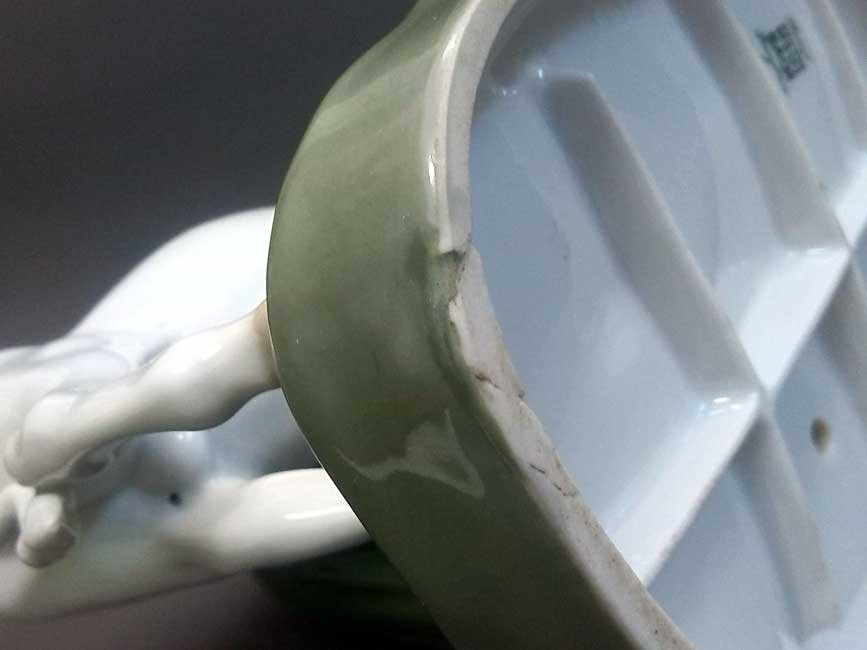 Zustand ohne Beschädigungen. Ein Brandriss innen im Sockel, herstellungsbedingt unter Glasur.