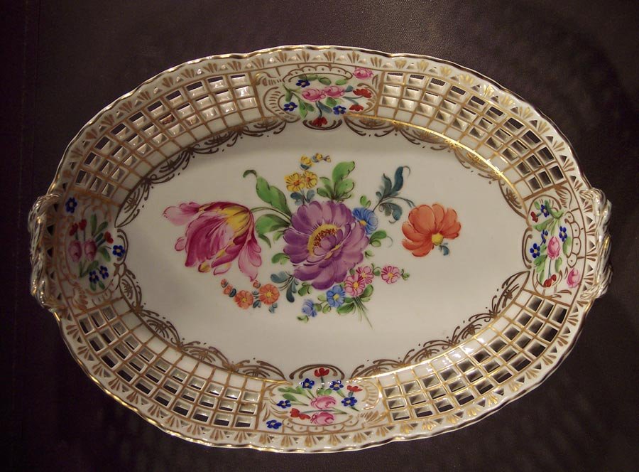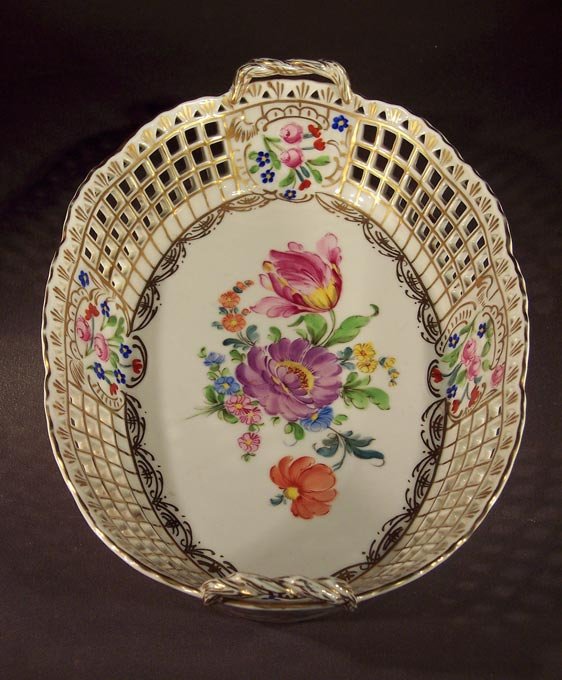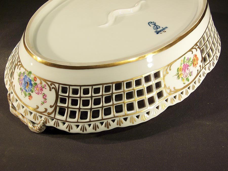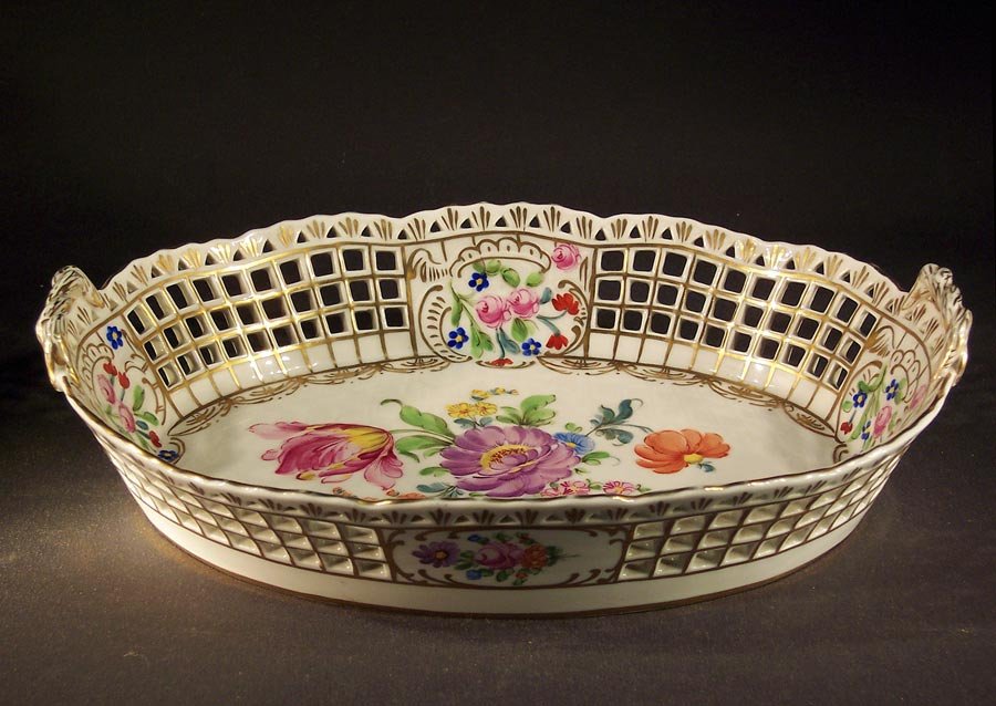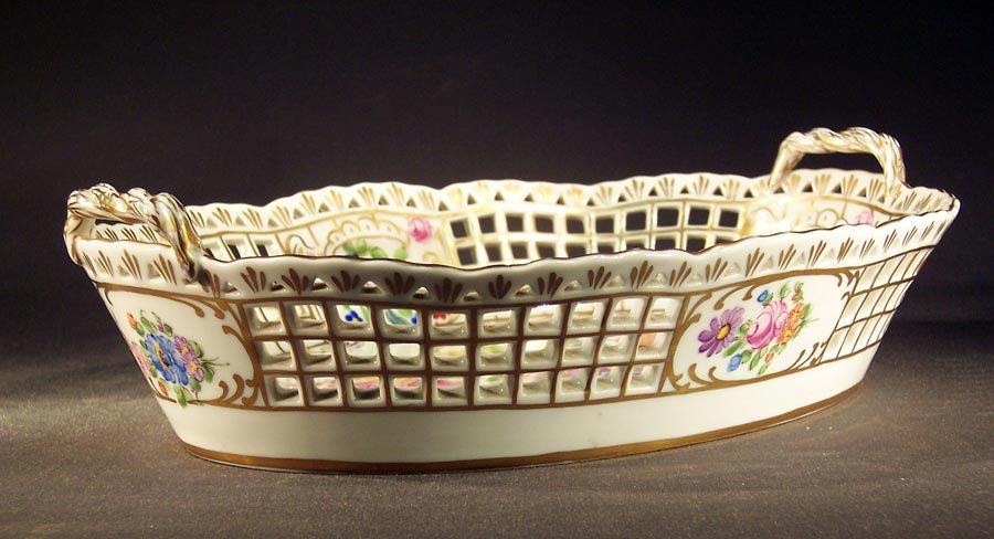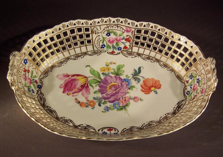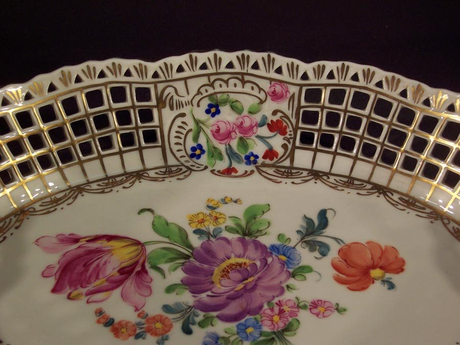 Porzellanschale mit Gitterrand, Blumenmalerei mit Gold. Henkelschale.