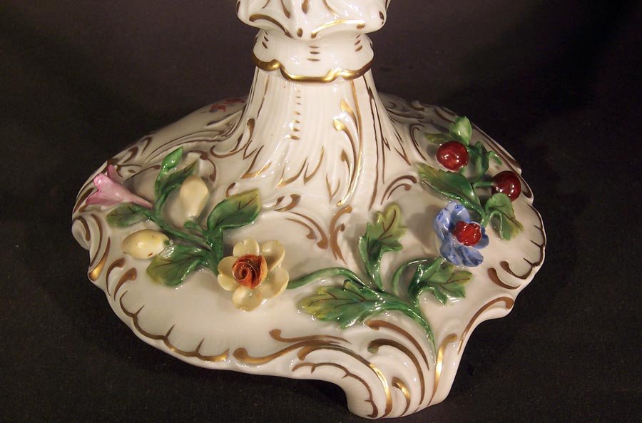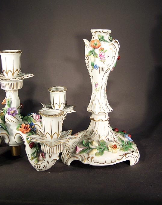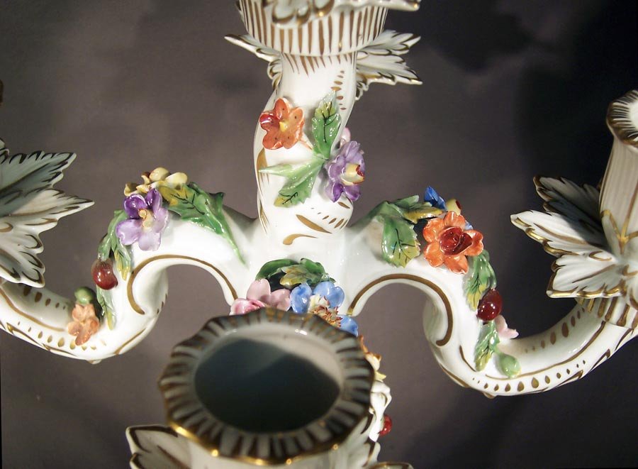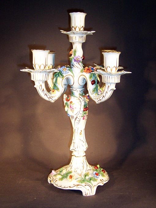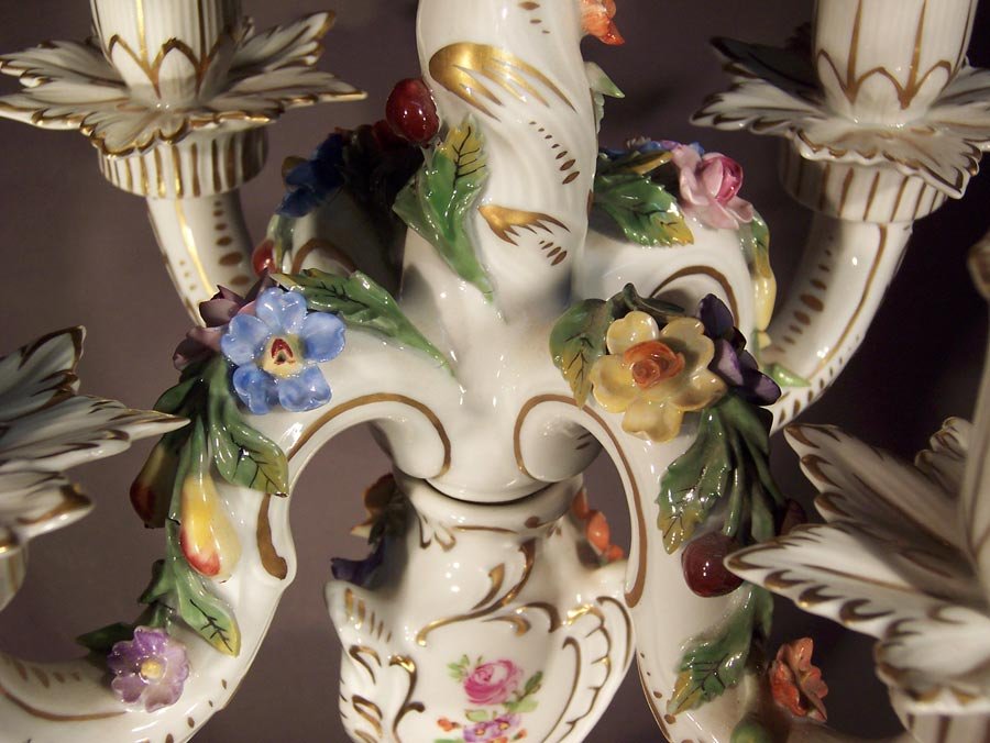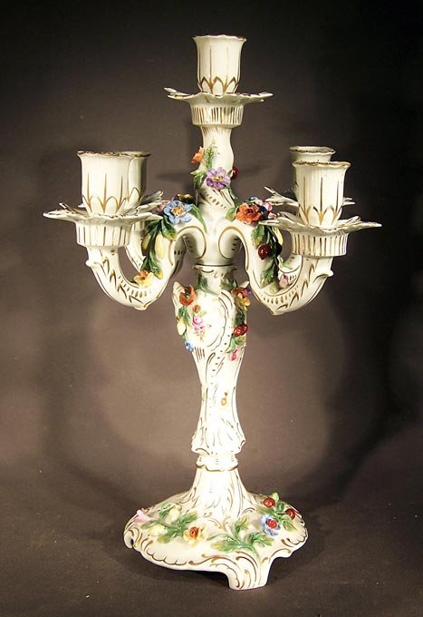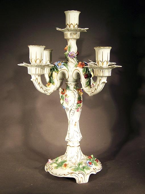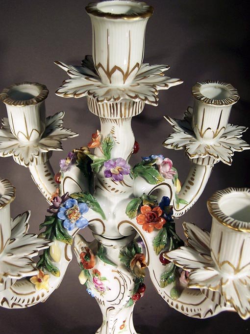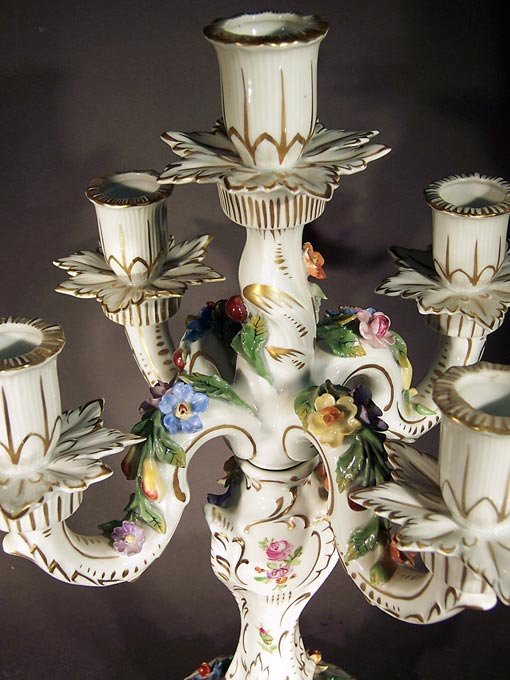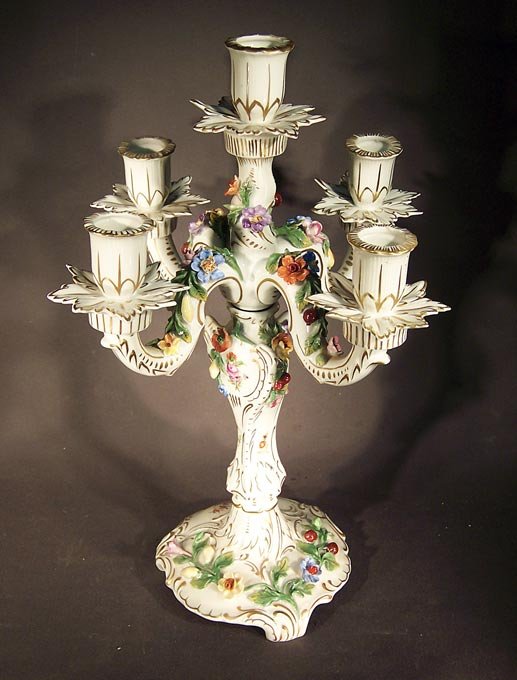 Großer Kerzenleuchter 5 flammig. Reicher Blütenbesatz, farbig staffiert. Sächsische Porzellanmanufaktur Dresden.