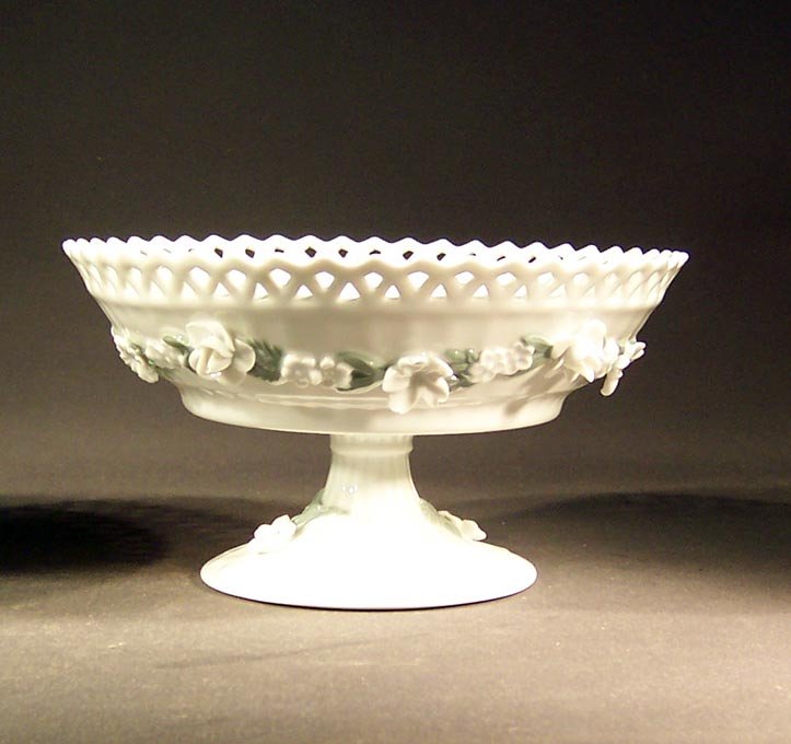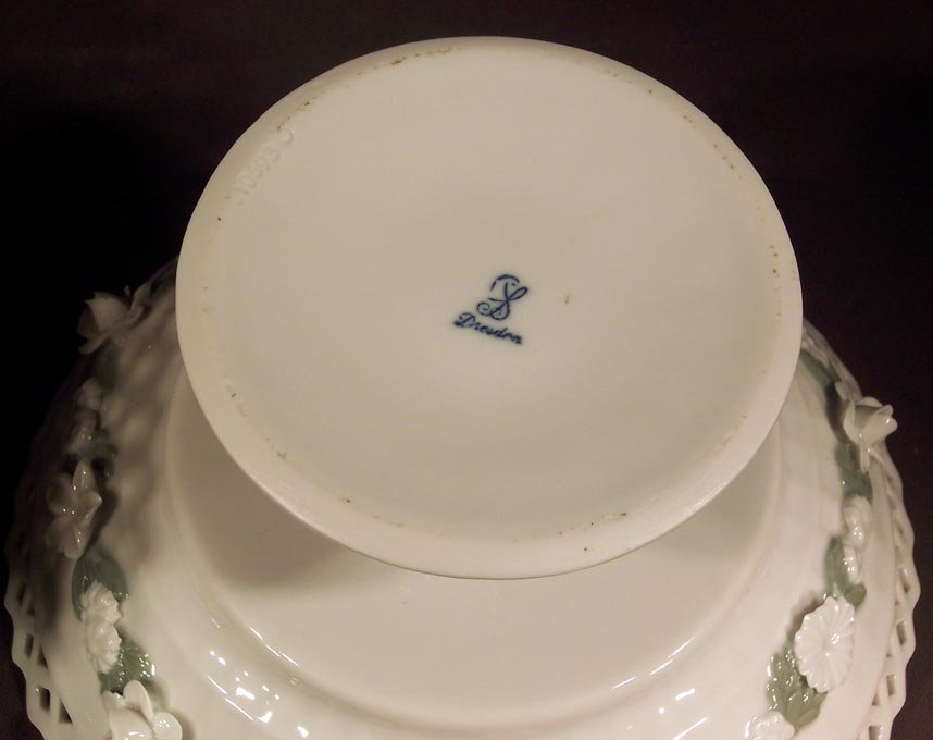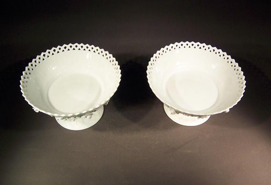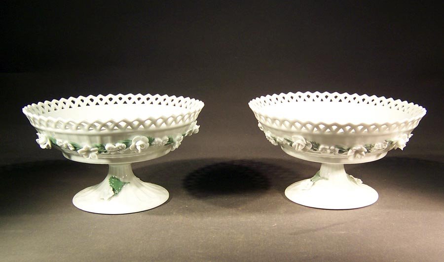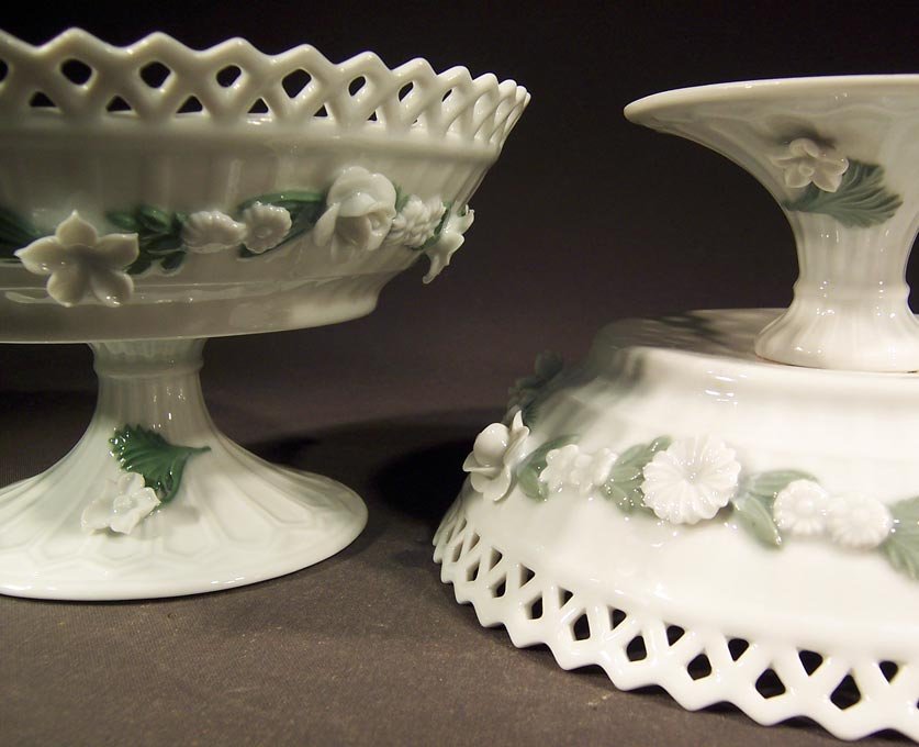 Zwei Fußschalen, Jardinieren mit durchbrochenem Gitterrand, Blütenbesatz sowie dezent grüne Staffage.