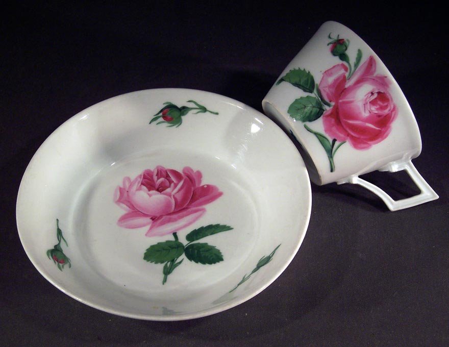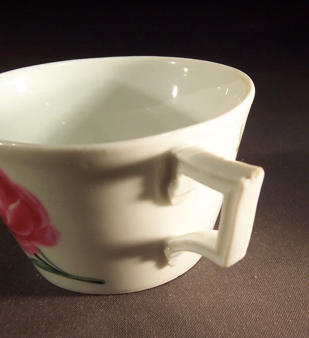 Tasse mit Untertasse ca 1820-1850, Schmierzeit. Zylindrische Form nach unten verjüngt, eckiger Henkel, Untetasse mit hochgezogenem Rand.