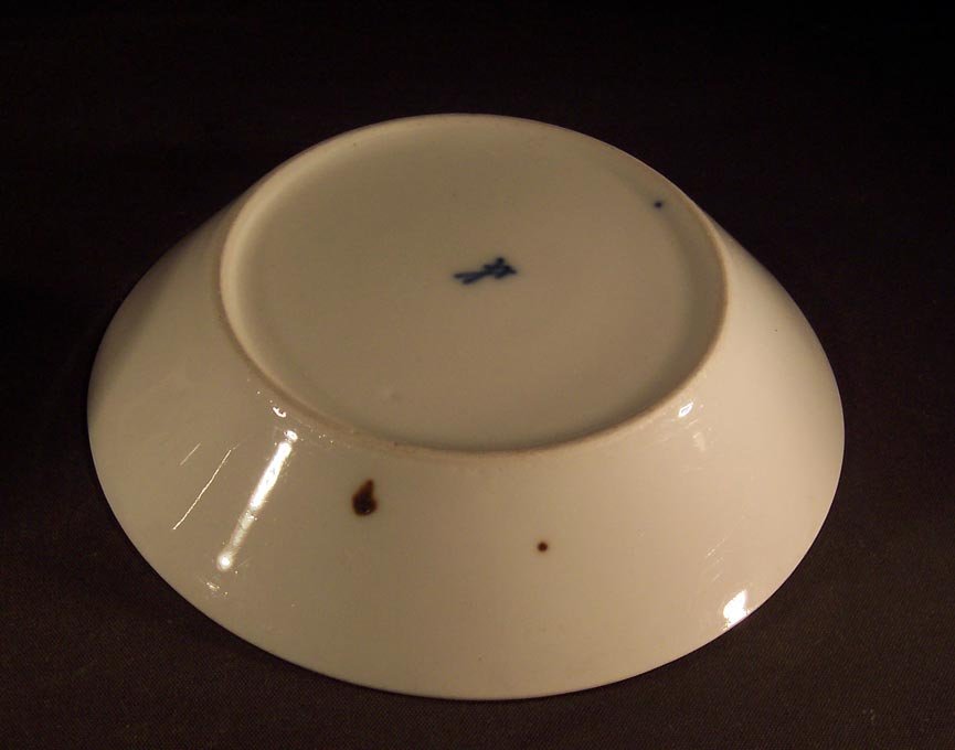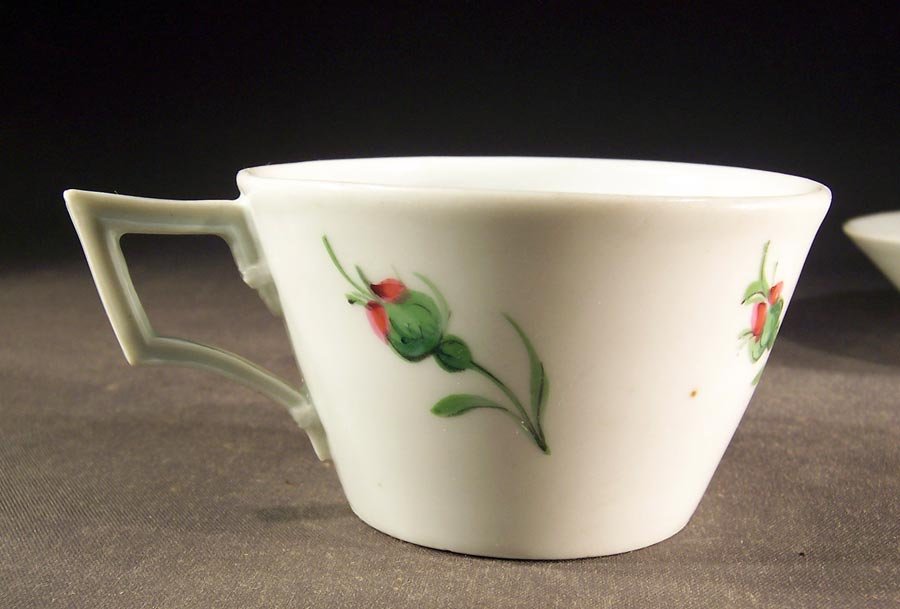 Die Tasse ist in einer zeittypischen Herstellungsweise und Qualität. Sie hat kleine Glasureischlüsse. Der Unterteller hat rückseitig einen Brandpunkt. Äußere, obere Kante (a.d.Spitze) des Henkels gechipt. Keine weiteren Beschädigungen, minimale Gebrachsspuren.