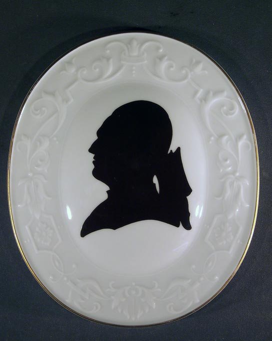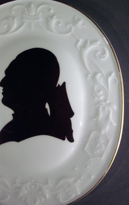 Ovale Plakette mit Reliefrand, auf dem gewolbten Mitteloval ein Profilbild in der Art eines Scherenschnittes. Die äußere Kante vergoldet.
