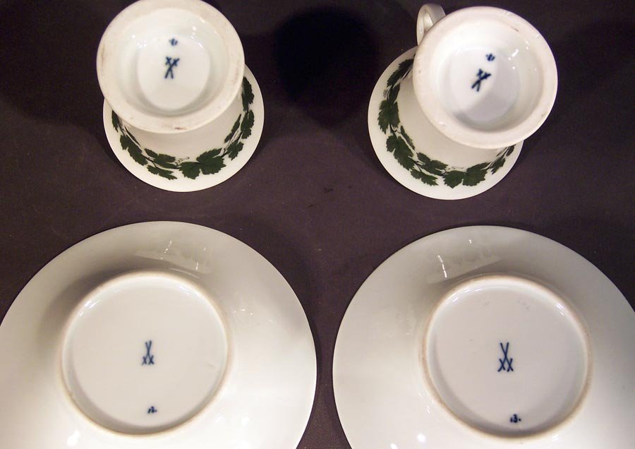 Blaue Schwertermarke von Meissen. Die Untertassen 1. Wahl ohne Schleifstriche, die Tassen 2 mal geritzt.