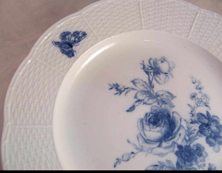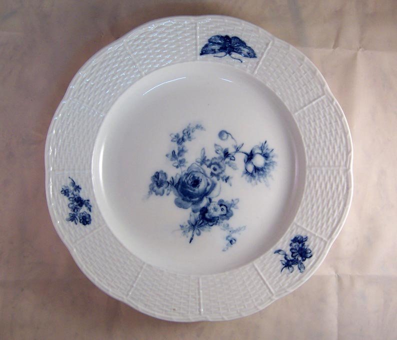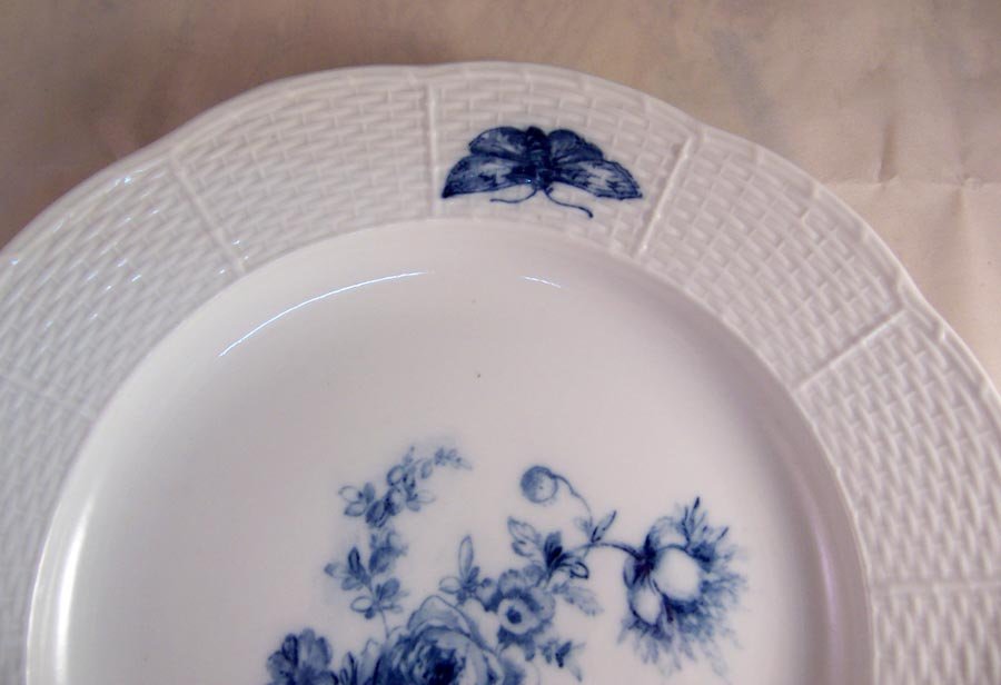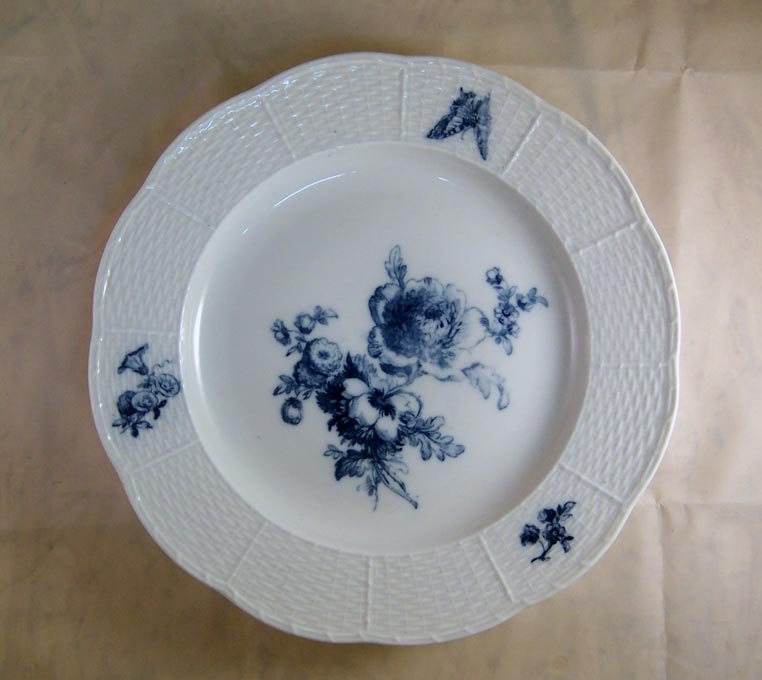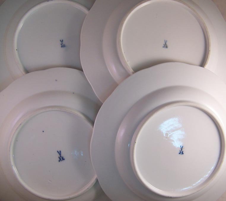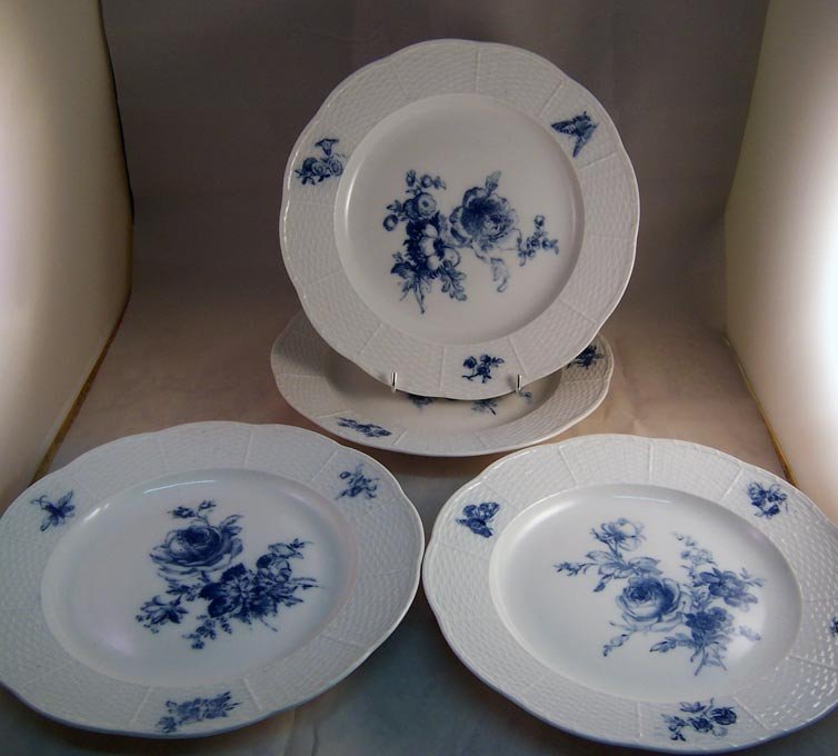 Meissen um 1880, 4 Teller, Blaue Blumen mit Insekten, Altozier Flechtrand.