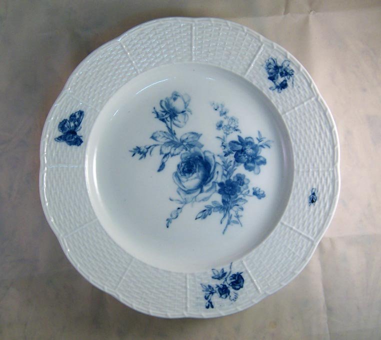 Meissen, 4 Teller, Blaue Blumen mit Insekten, Altozier Flechtrand