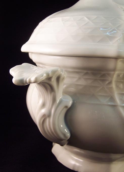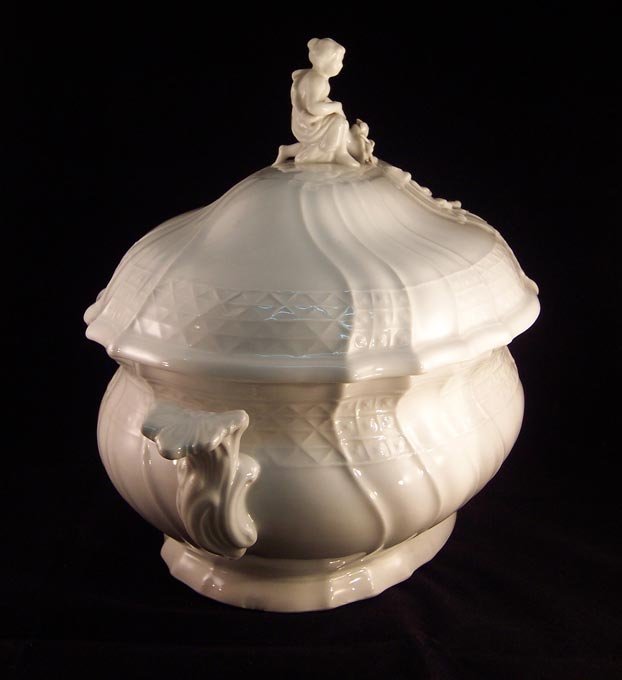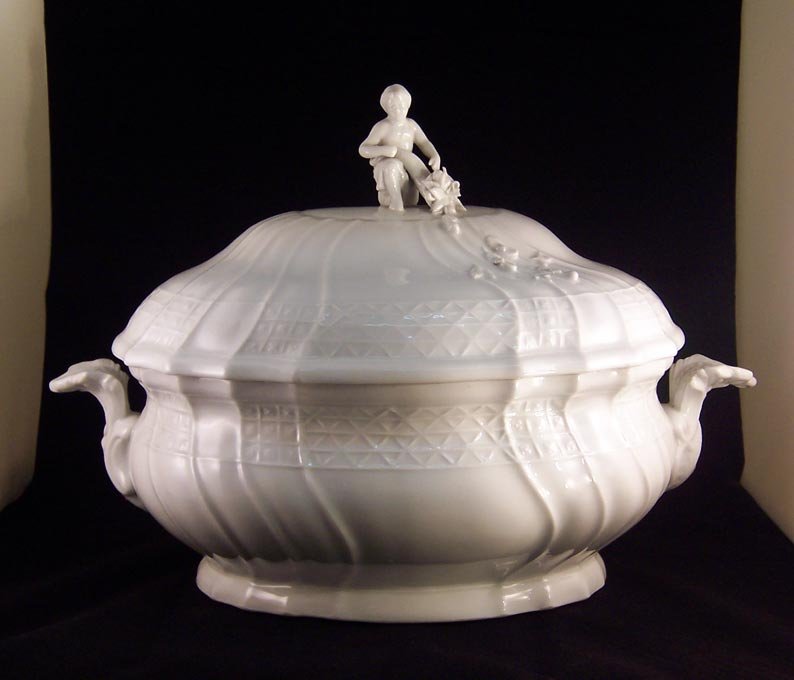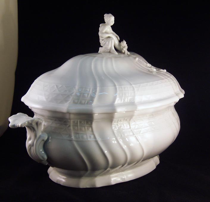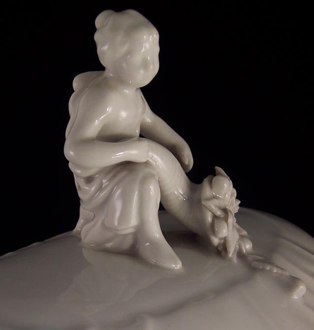 Reserviert! Große Terrine, weißes Porzellan. Reliefdekor Neubrandenstein, Figur mit Füllhorn als Deckelknauf.