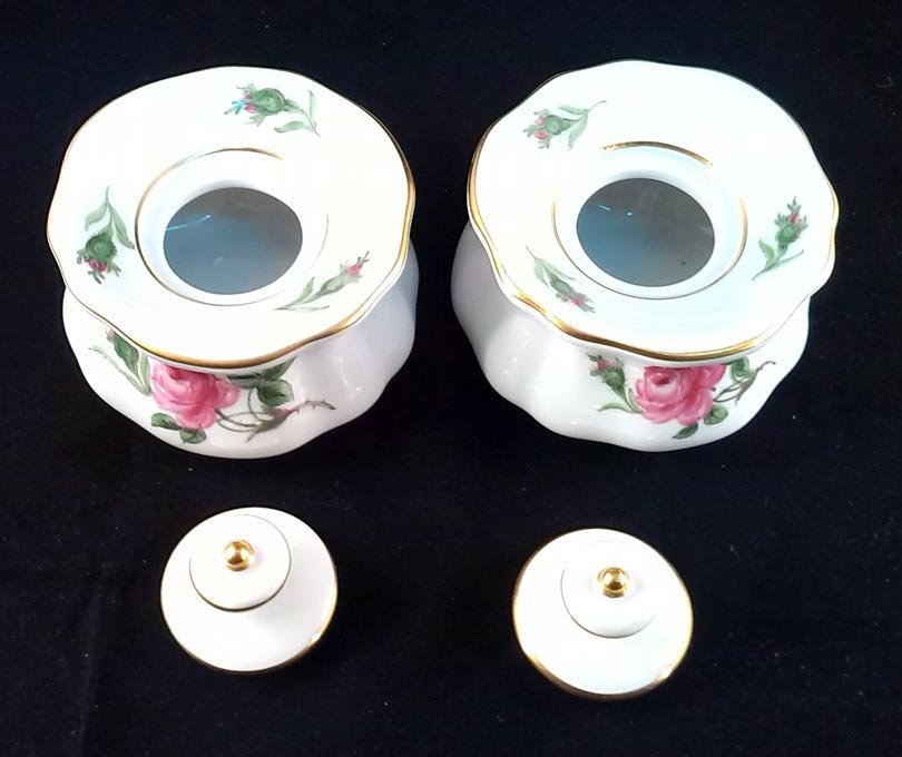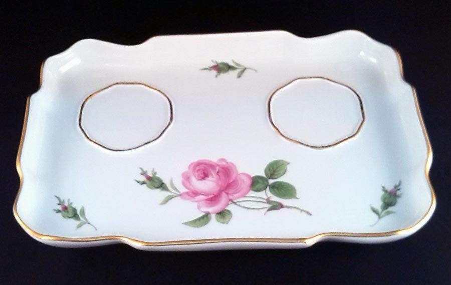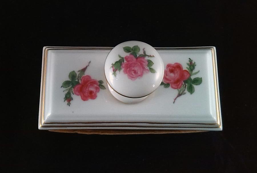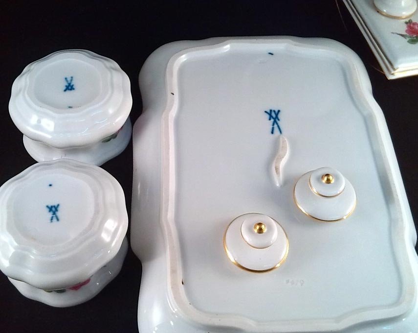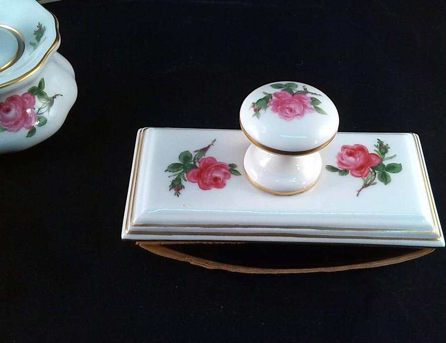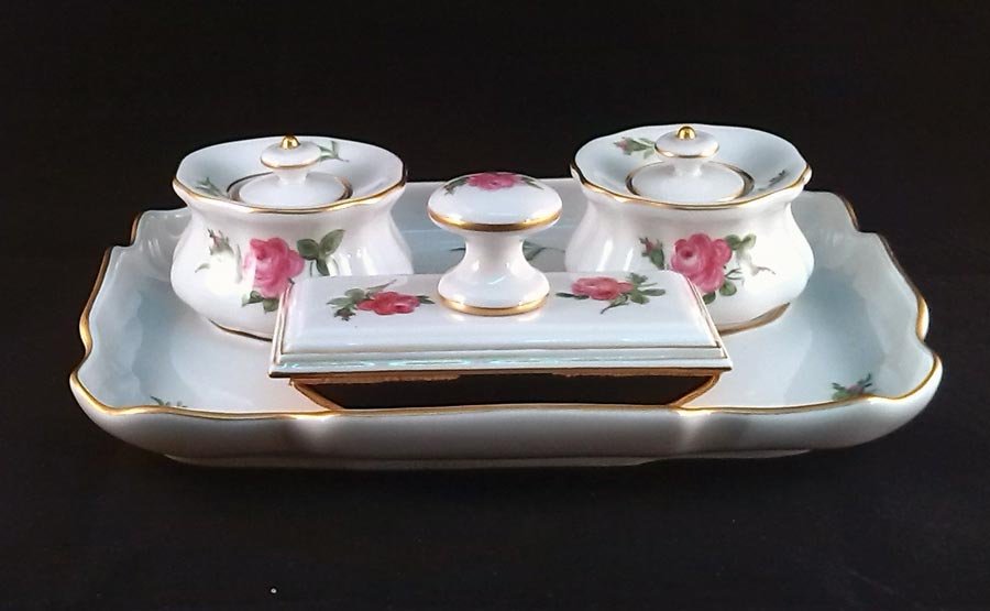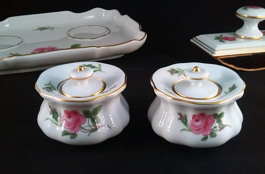 Manufaktur Meissen, Rote Rose mit Gold, Schreibset bestehend aus Stiftschale, 2 Tintenfässchen und Löschwiege.