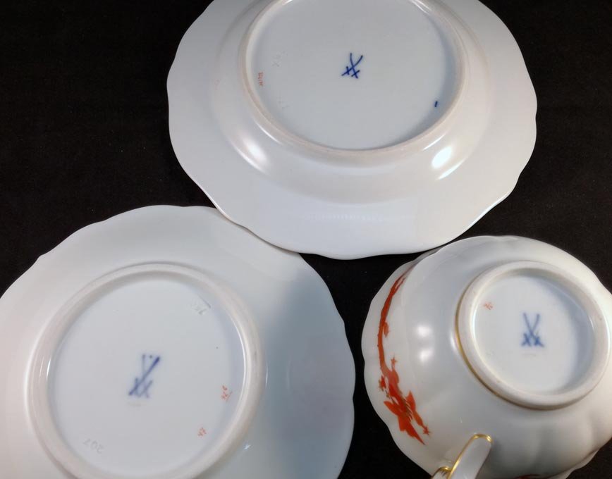 Manufaktur Meissen Blaue Schwertermarke, Kuchenteller 1.Wahl ohne Schleifstriche, Tasse und Untertasse ein Schleifstrich neben den Schwertern.
