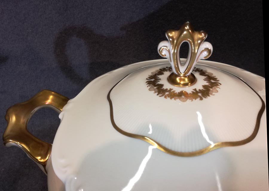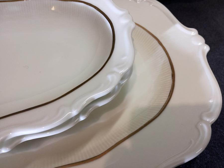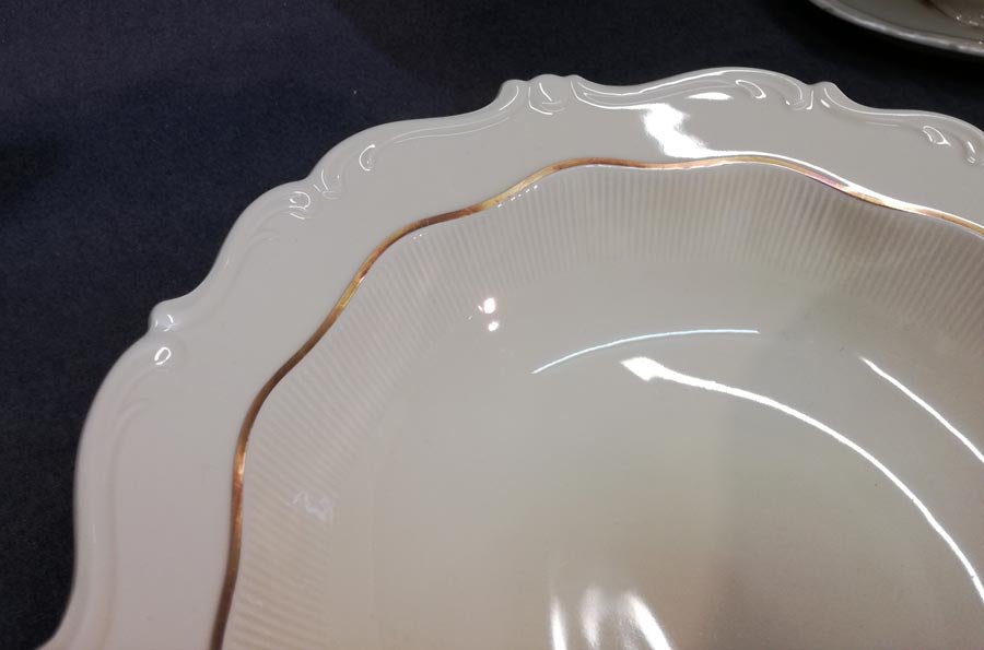 Elfenbeinfarbenes Porzellan mit Reliefkanten und Gold. Im inneren Bereich jedes Teil mit riffelartigen Flächen.
