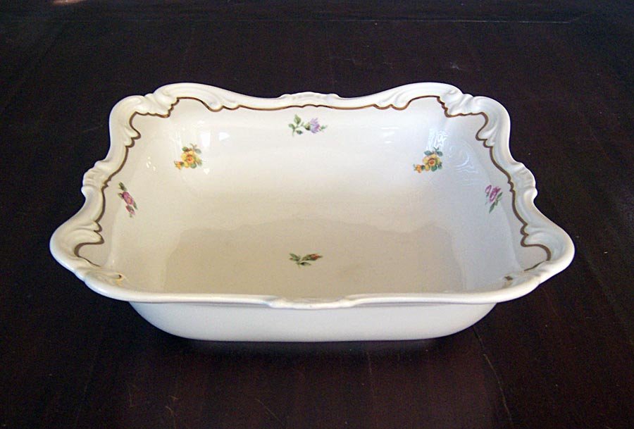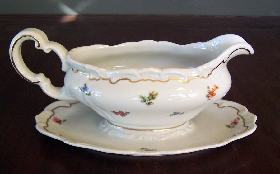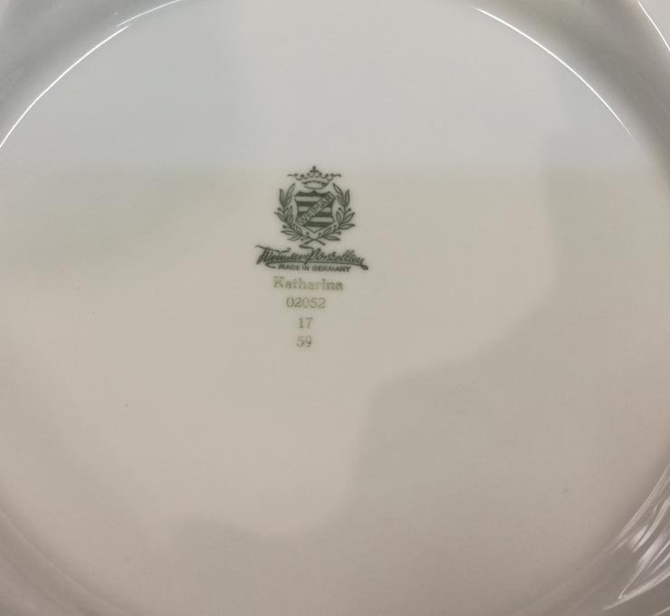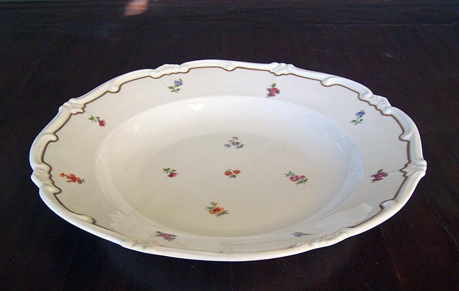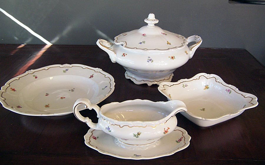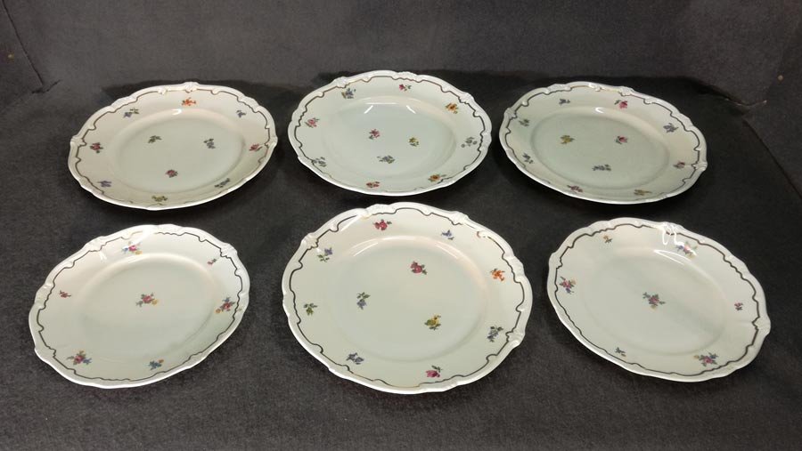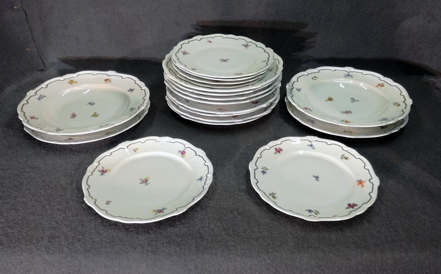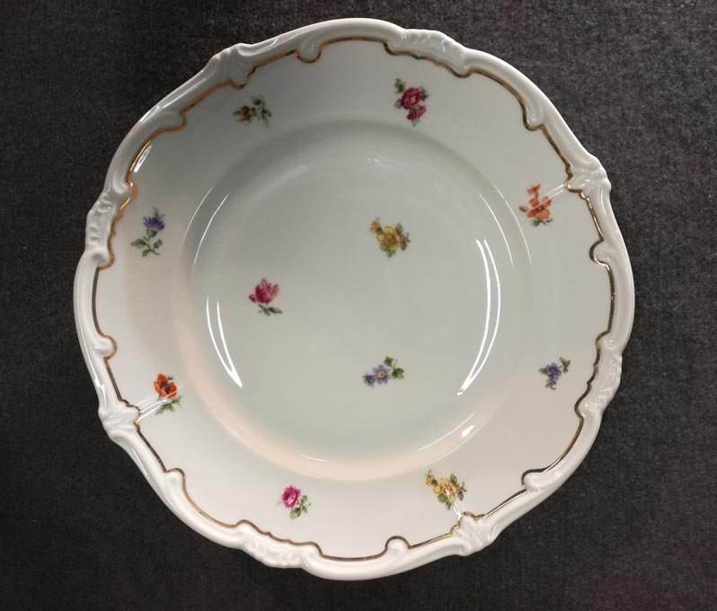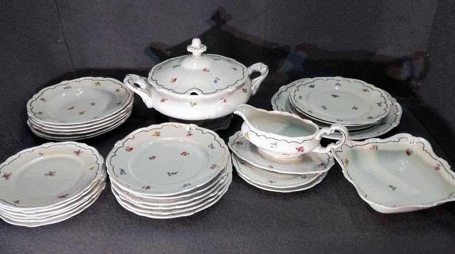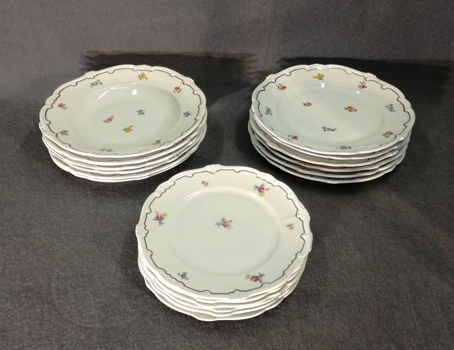 Service, Weimar Porzellan, Thüringen. Speiseservice Form/Dekor "Katharina", leicht elfenbeinfarbnes Porzellan, geschwungener und reliefierter Rand, Streublümchen und Gold.