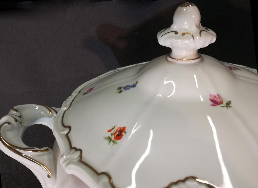 Sehr guter Zustand, geringe, unbedeutende Gebrauchsspuren. Knauf der Terrine repariert (Foto) ohne Materialverlust.