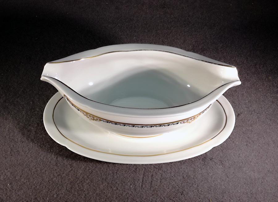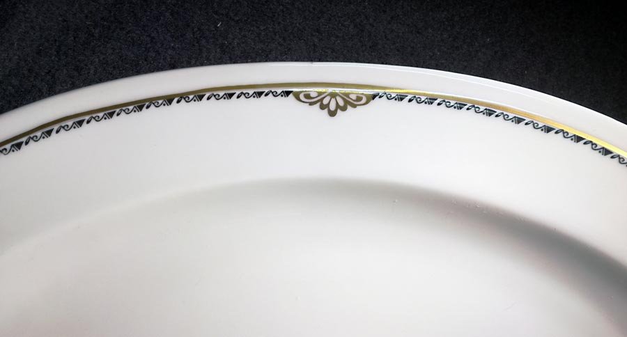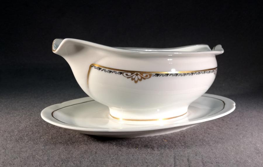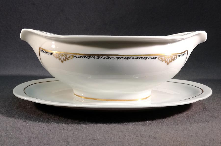 Leicht Elfenbeinfarbiges Porzellen mit schöner Art Deko Kante in Schwarz und Gold sowie weiteren Goldverzierungen.
