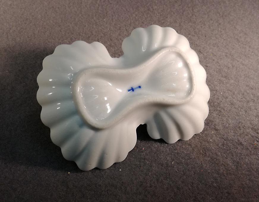 Doppelte Gewürzschale in Form einer aufgelappten Muschel, runder astartiger Henkel.