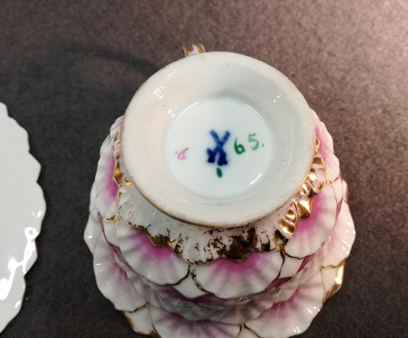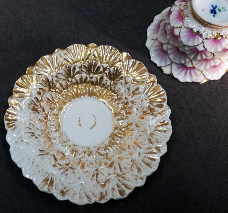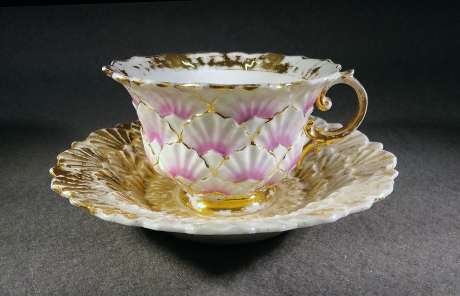 Meissen Biedermeiertasse um 1820, Prunktasse. Reliefiert, Rosa mit Gold.