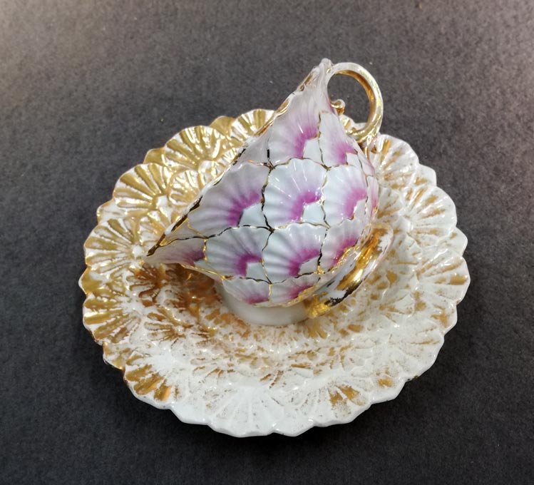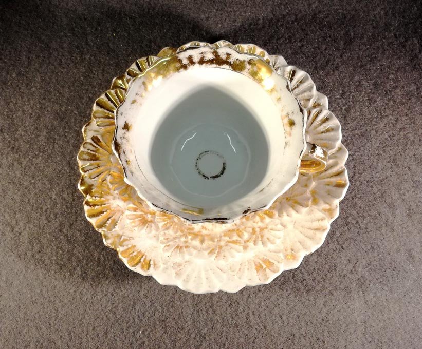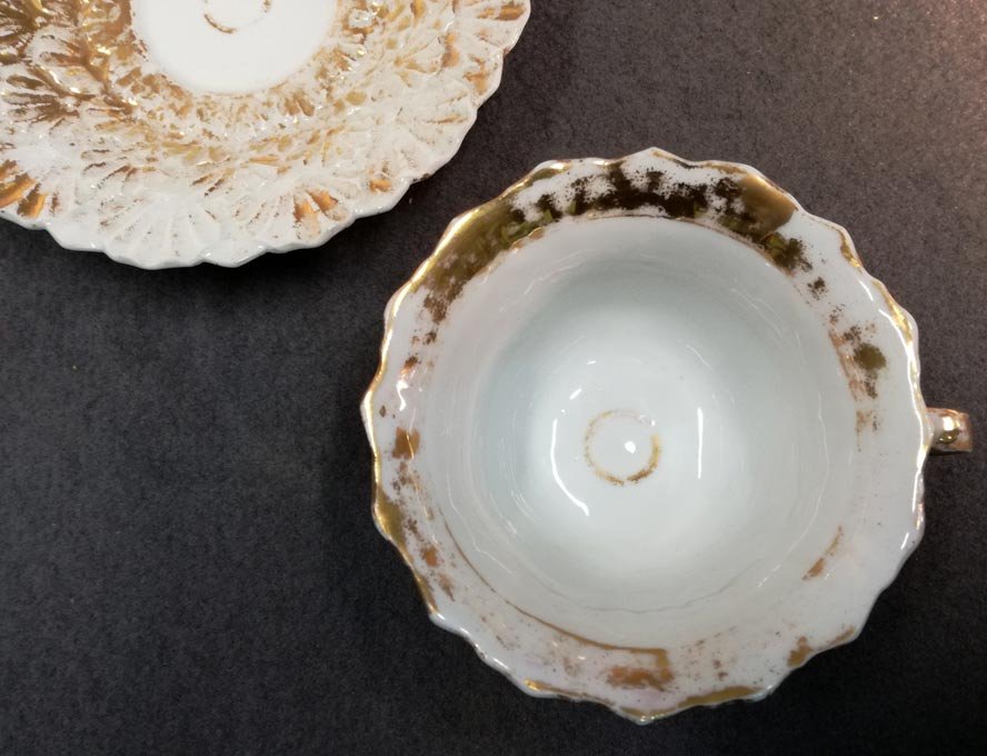 Tasse mit Goldabrieb, die Untertasse rückseitig am Standring ein Abplatzer. Sonst gut erhalten.