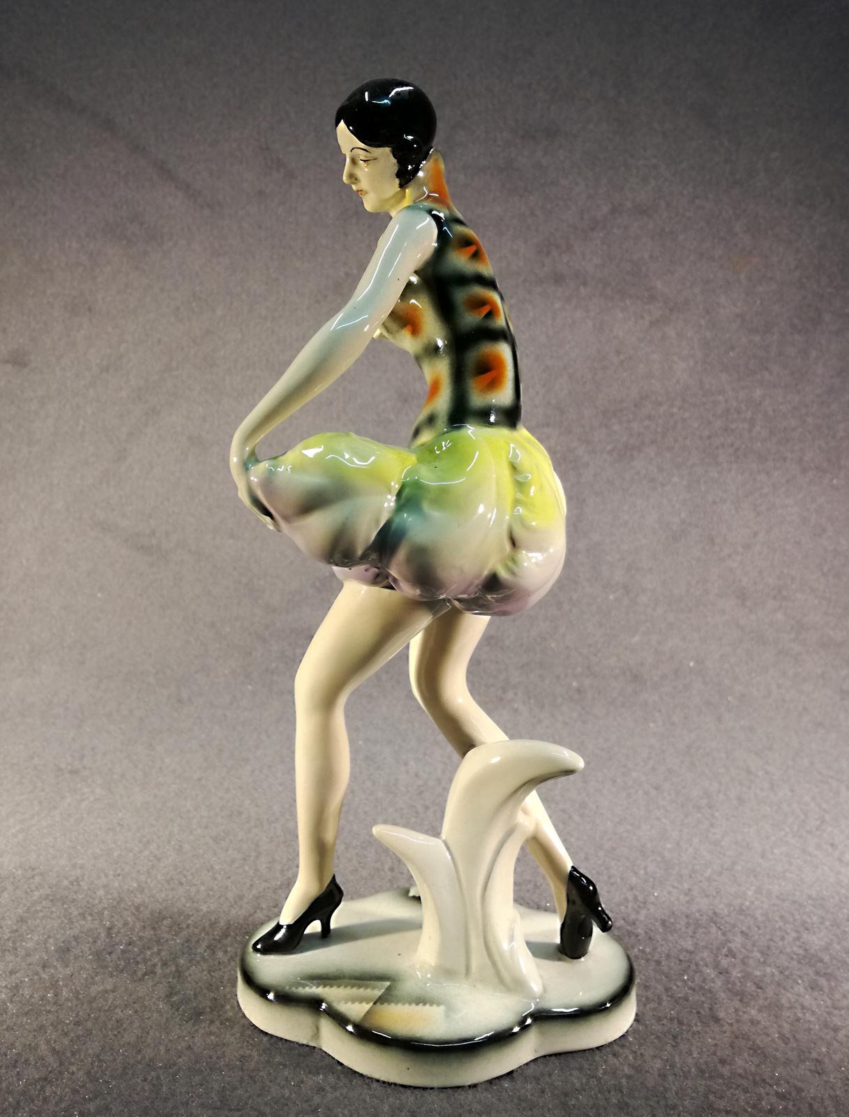 Tänzerin, Art Deco, Volkstedt. Seltene, schöne Figur, Fayence, Keramik farbig glasiert. Auf Vierpaßsockel stehende Tänzerin mit weit offenem Dekolleté und Federröckchen.