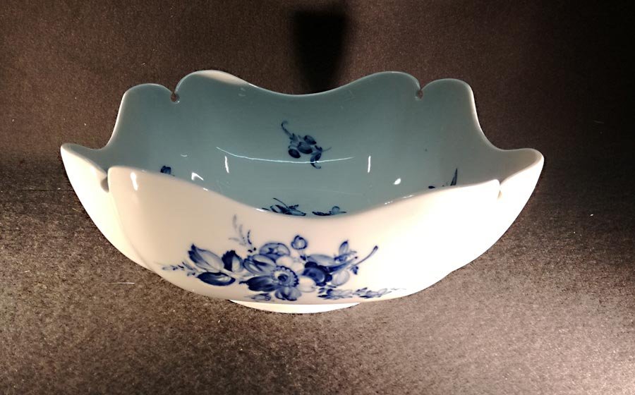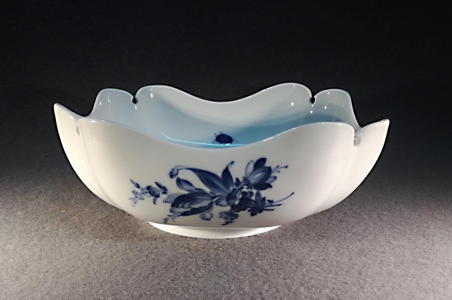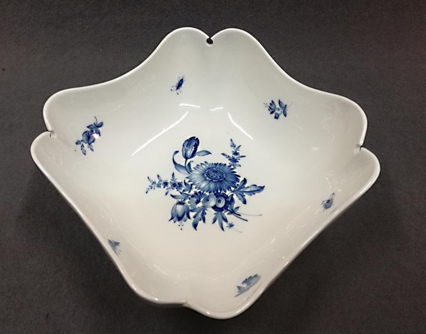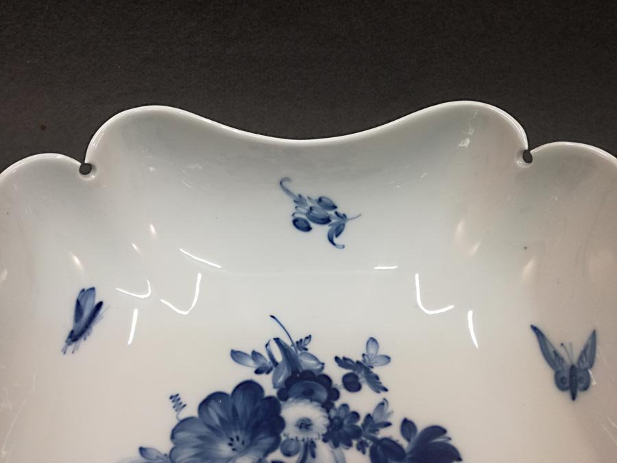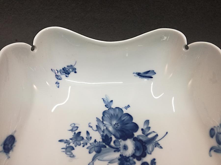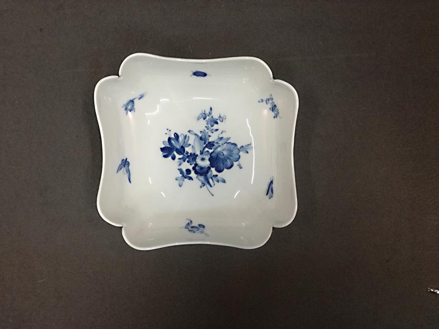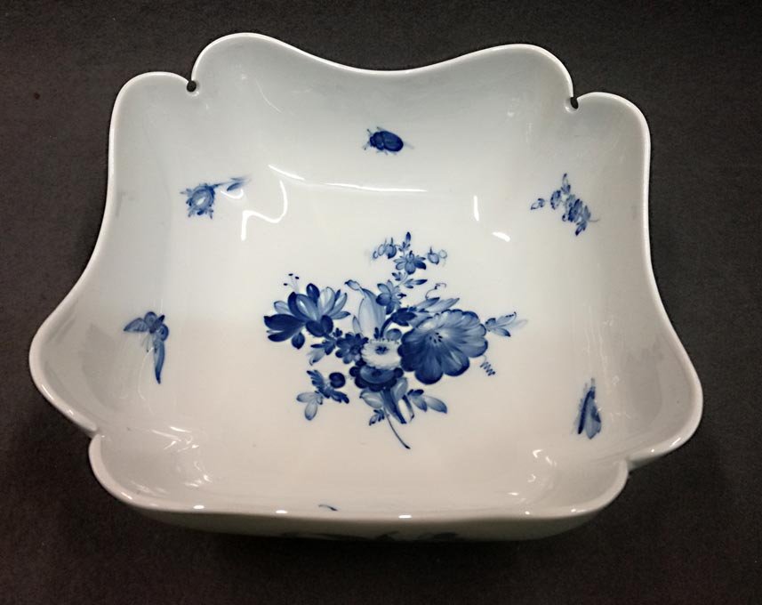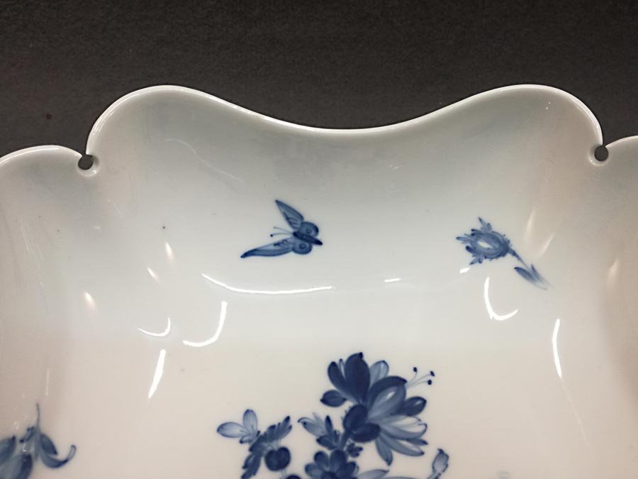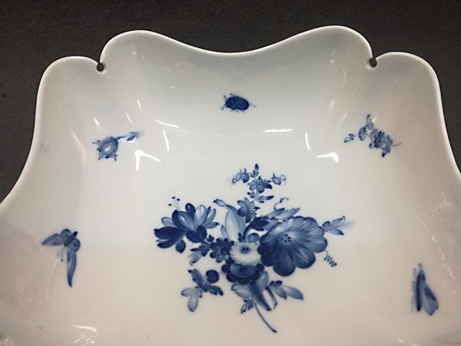 Große Viereckschale mit geschwungenem Rand. Malerei mit Insekten und Blumen in Blau.