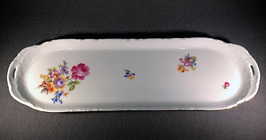 Schöner Blumendekor und Goldrand. Rand und Griffe reliefiert und Kante vergoldet.