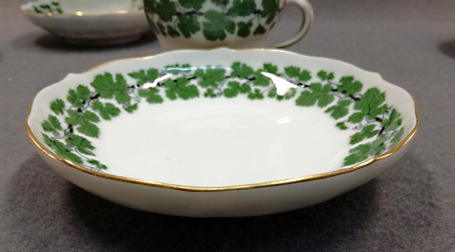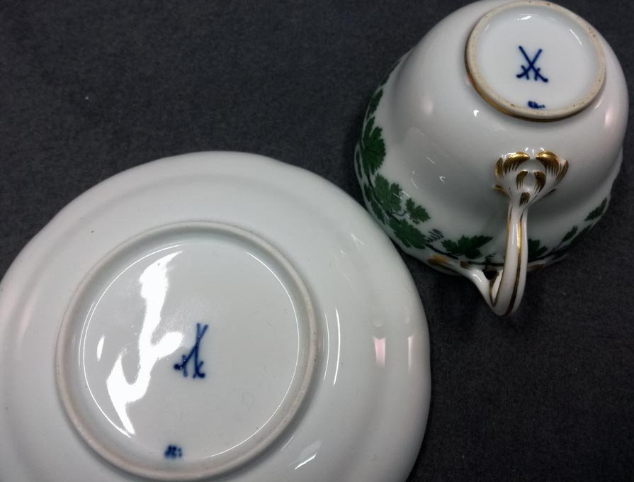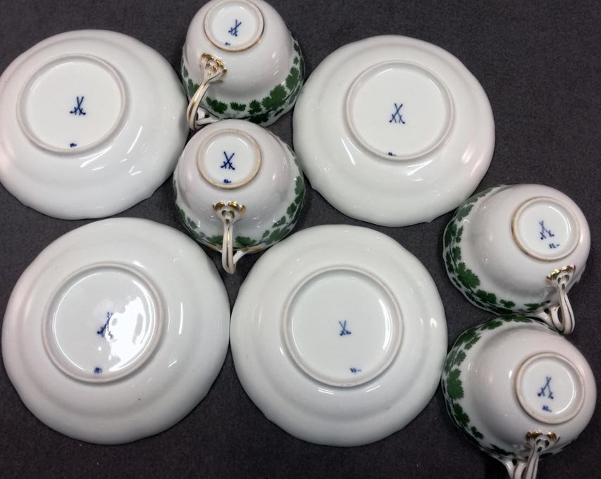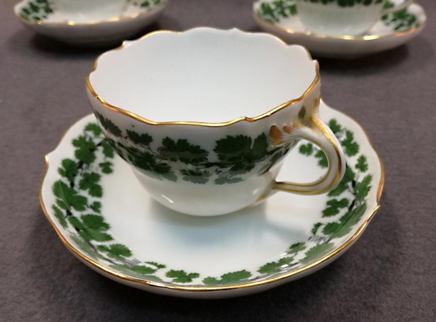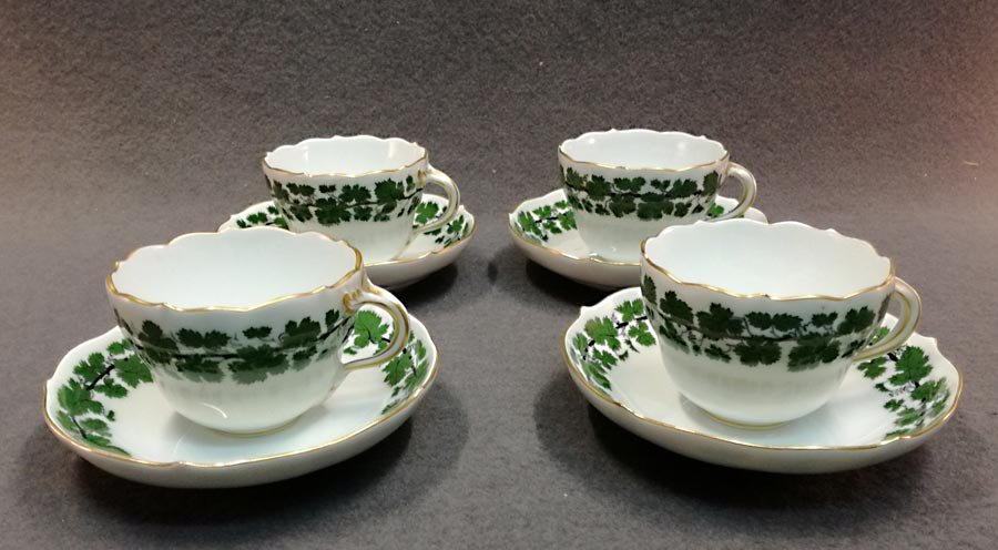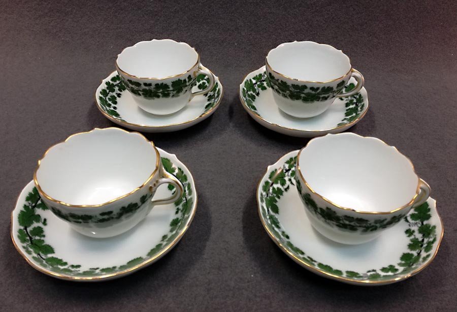 Meissen Weinlaub mit Gold 4 Kaffeetassen. 1. Wahl, Knaufzeit um 1880.