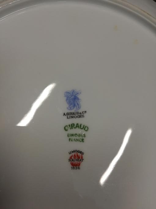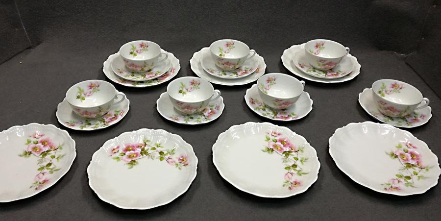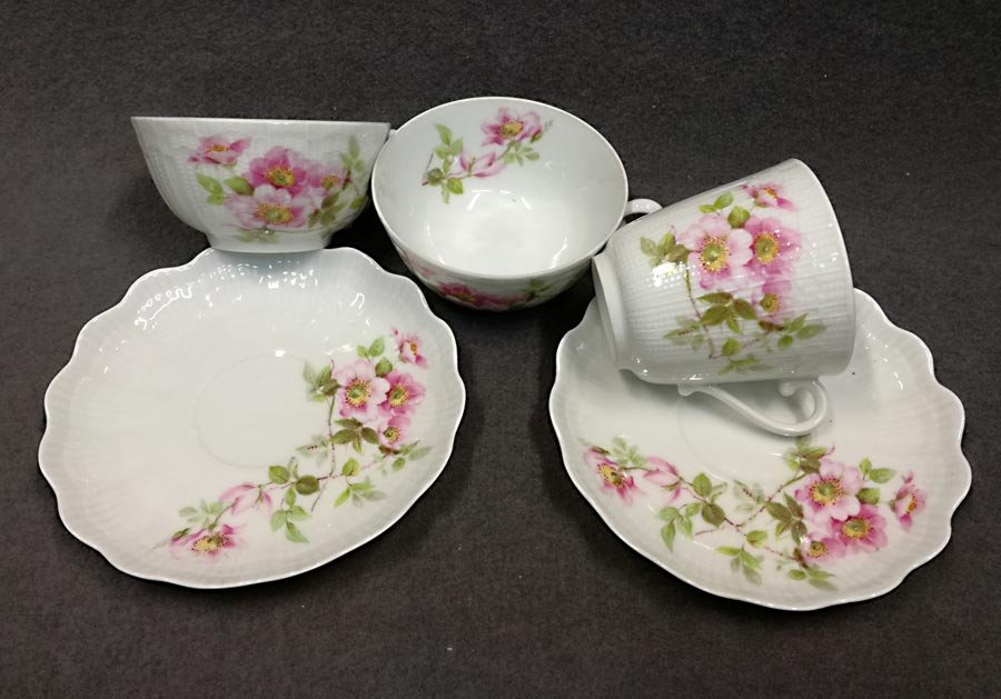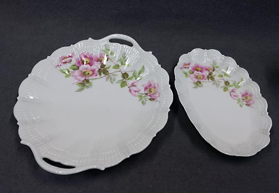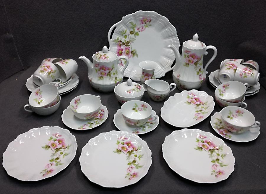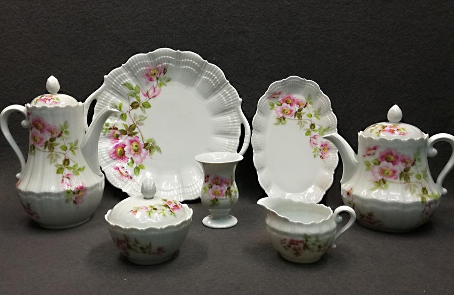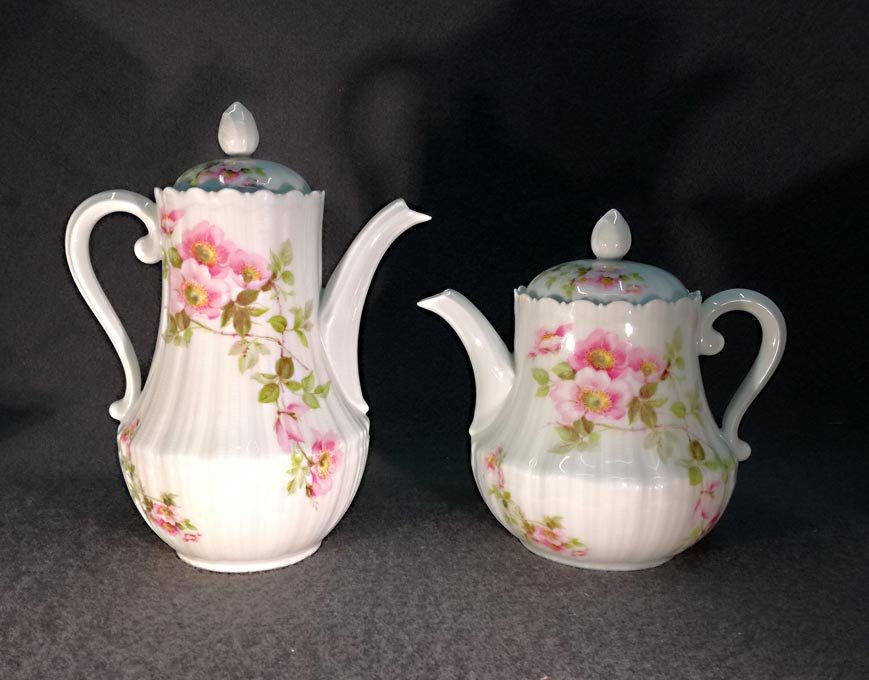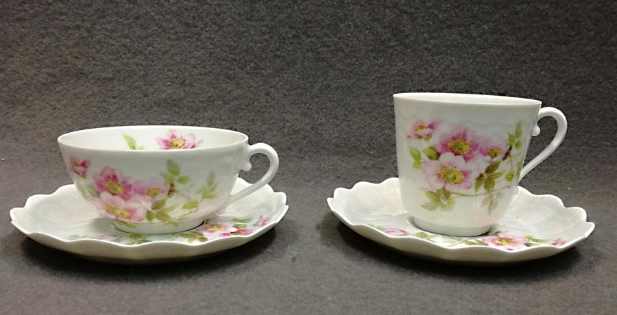 Limoges Giraud, Kaffeeservice und/oder Teeservice, Wildrose. Ränder bzw. den Seiten fächer- und muschelartig reliefiert. Ränder gezackt und ausgeschwungen.