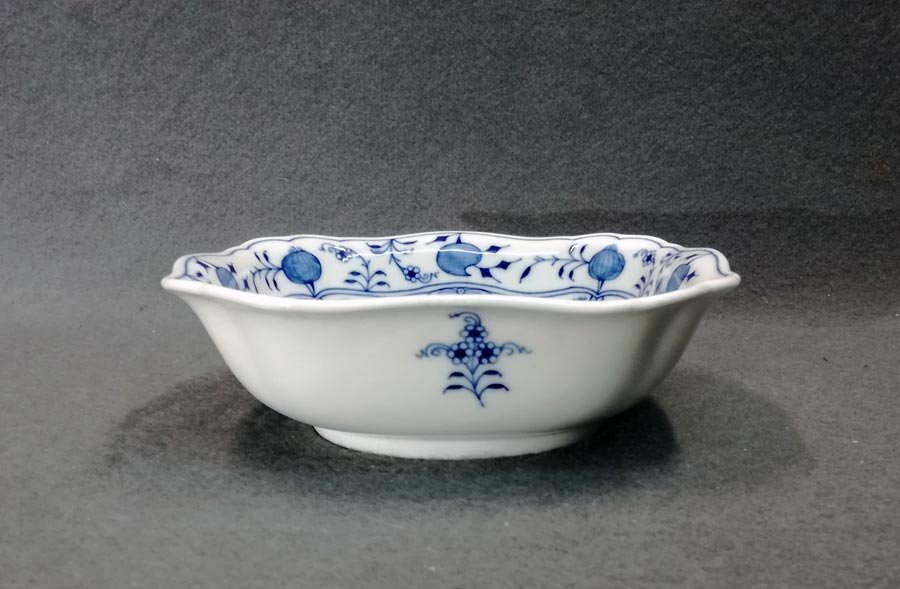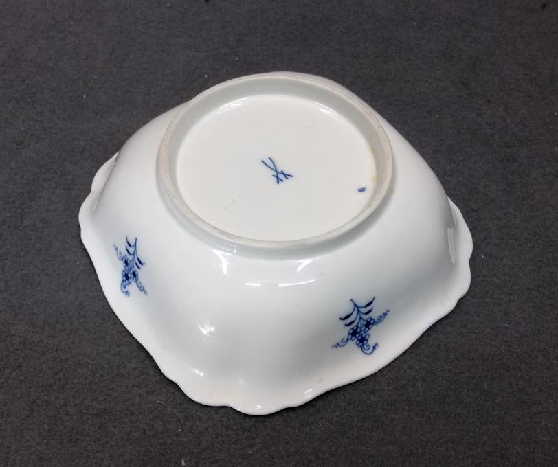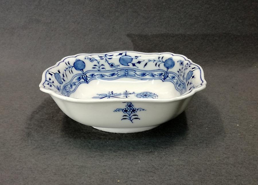 Meissen, Zwiebelmuster, kleine Schale; Viereckschale mit leicht geschwungenen Rändern. Aussenseiten bemalt.
