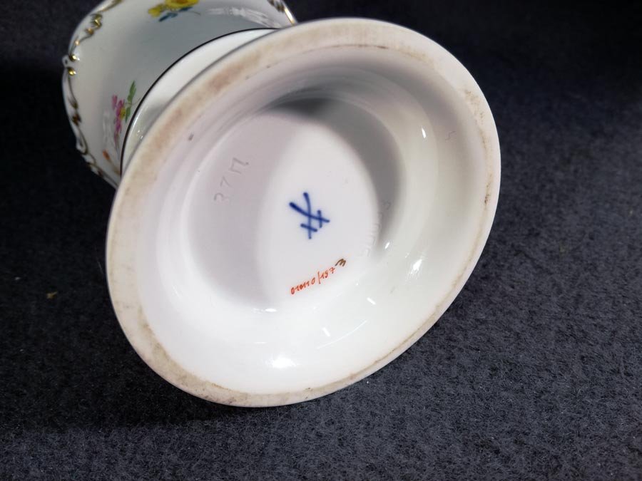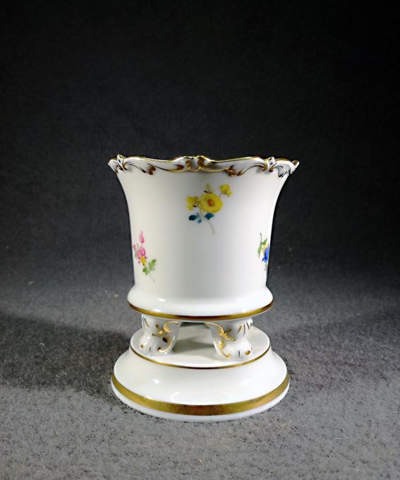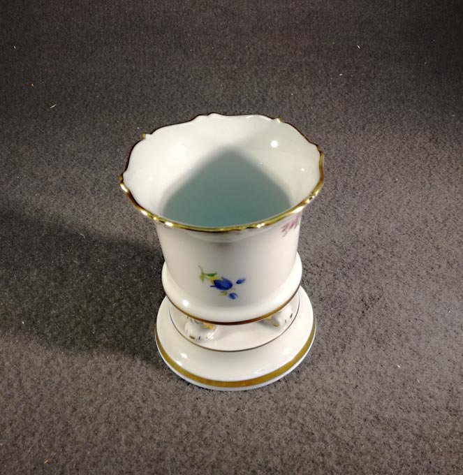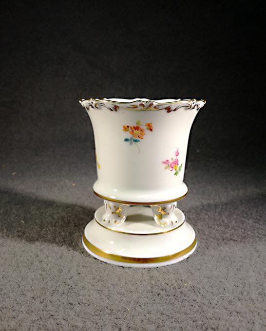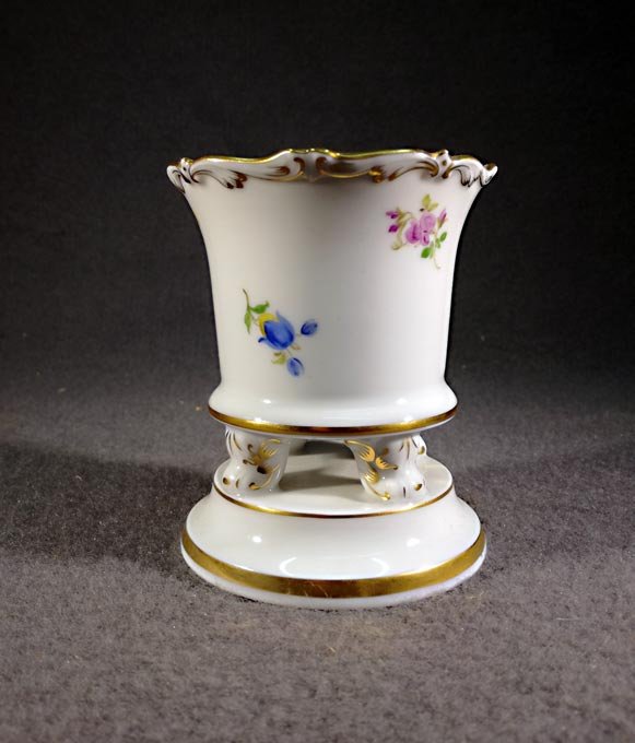 Meissen, Vase mit Füßchen auf Sockel. Streublümchen mit Goldrand und Goldverziehrungen. H. 8,5 cm, D. 7,2 cm..