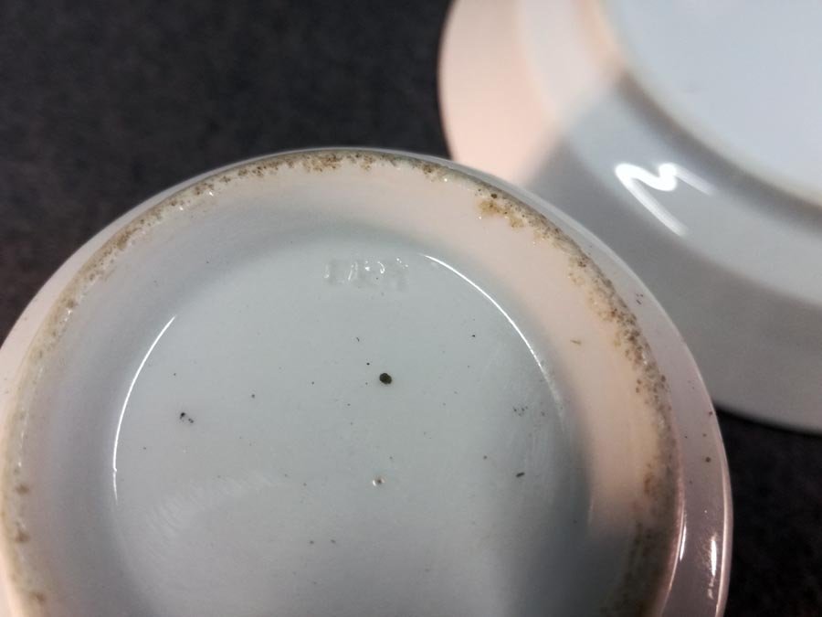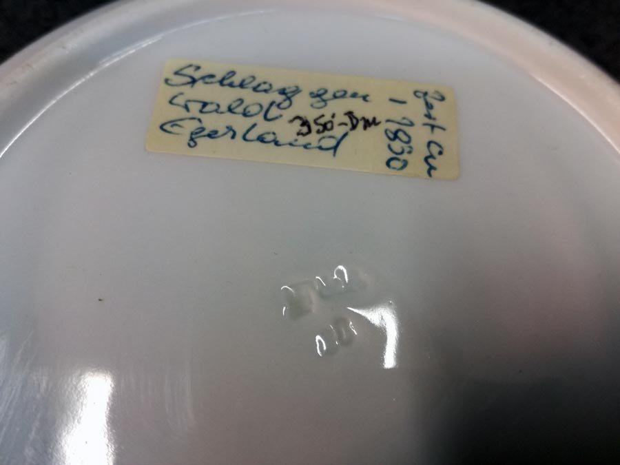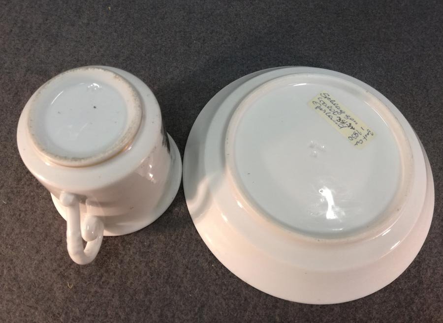 Auf der Untertasse altes handschriftliches Sammlungsetikett, beschriftet: "Schlaggenwald Egerland Zeit um 1830" sowie alter Vermerk zum Preis: "350,- DM" (diese Preise wurden gezahlt).