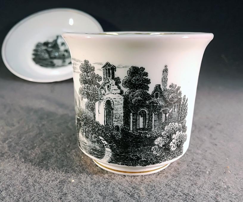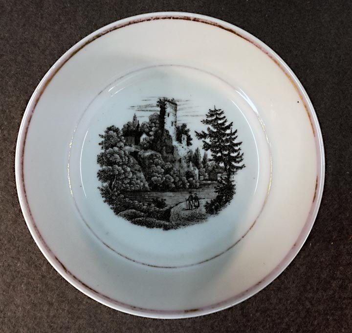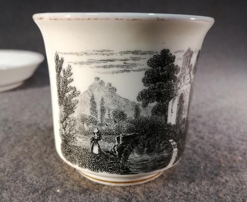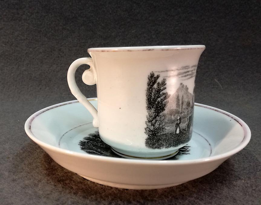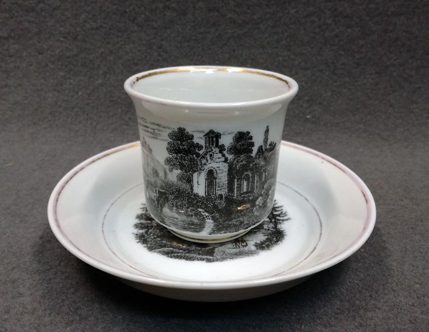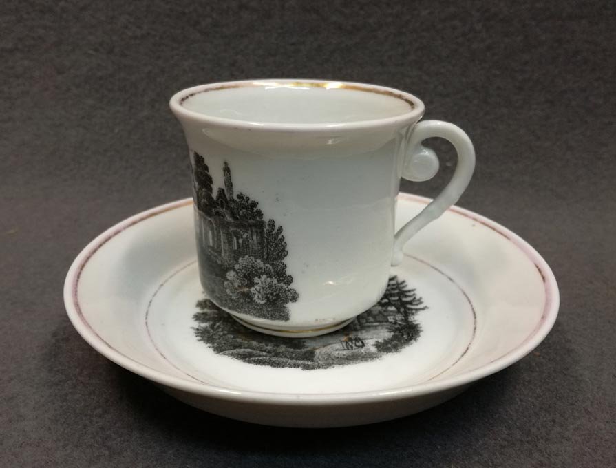 Biedermeier Tasse mit Untertasse um 1830-40, Pirkenhammer oder Schlaggenwald. Schwarzlotmalerei, Landschaft mit Gebäude, Personen und Tieren. Sehr schöne detailreiche Landschaftsdarstellung auf Tasse und Untertasse in Schwarzlotmalerei.