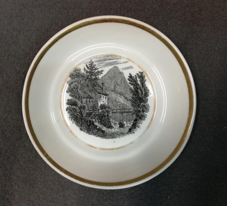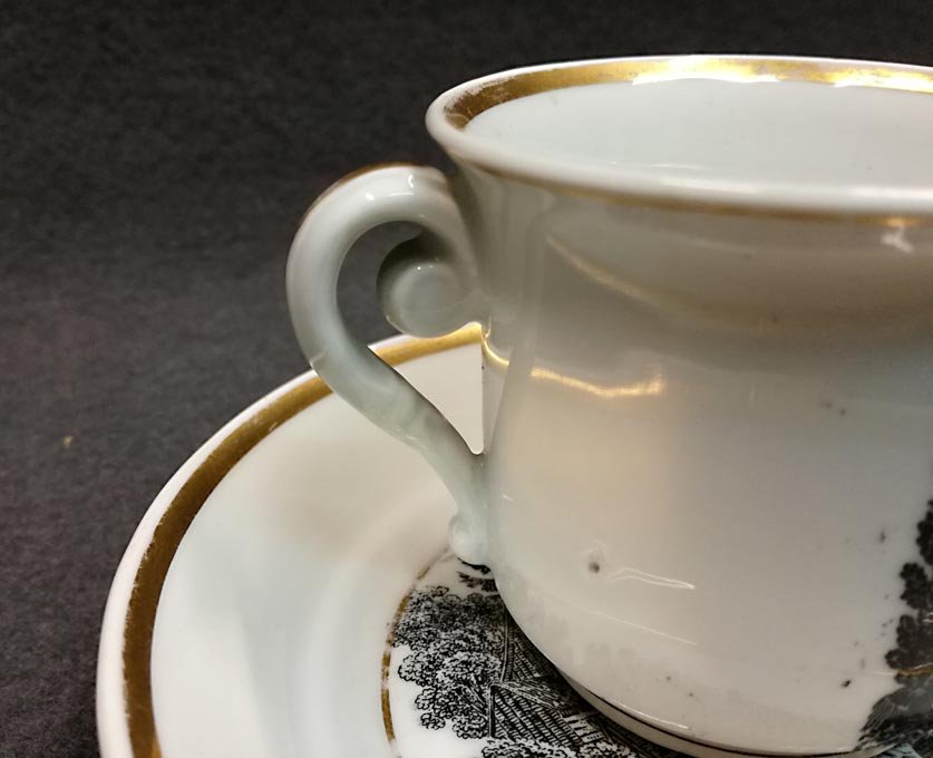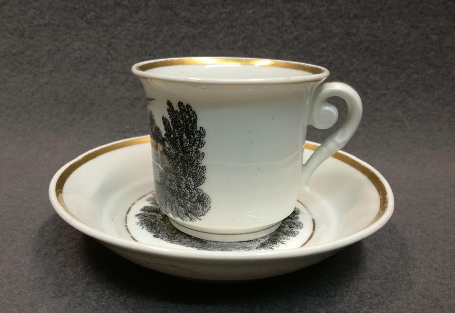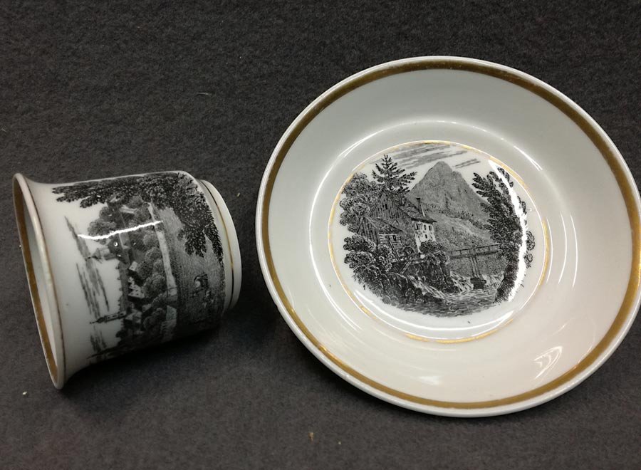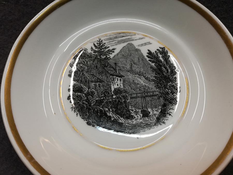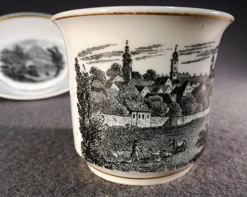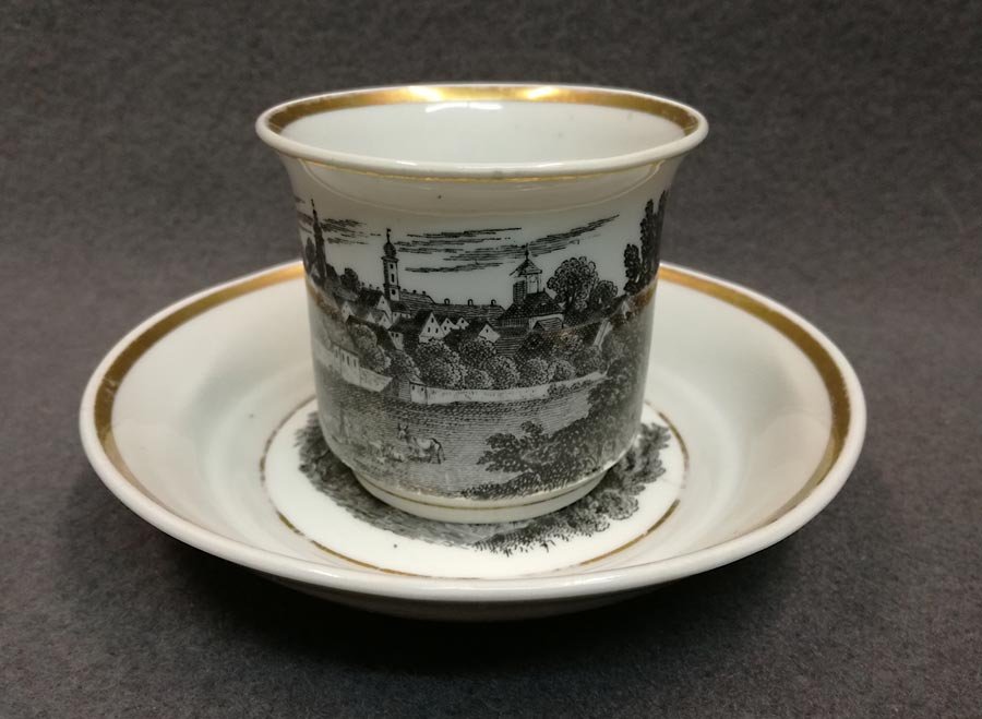 Biedermeier Tasse mit Untertasse um 1830-40, Schlaggenwald. Schwarzlotmalerei, Landschaft mit Gebäude, Personen und Tieren. Sehr schöne detailreiche Landschaftsdarstellung auf Tasse und Untertasse in Schwarzlotmalerei.