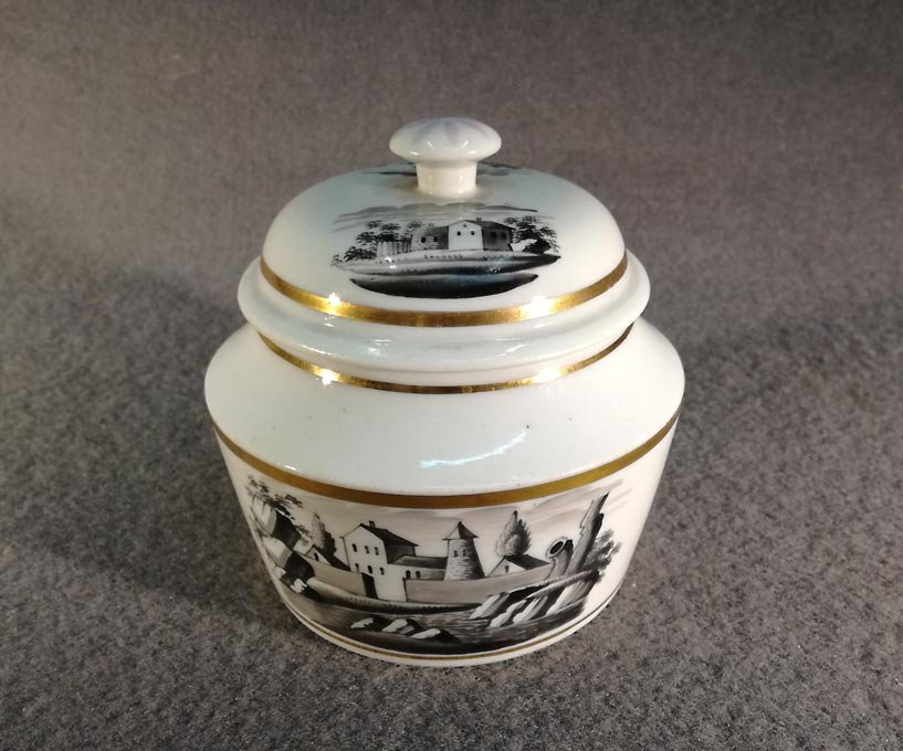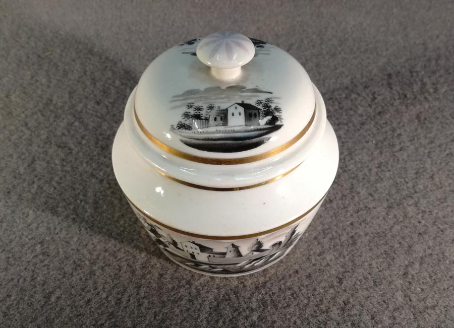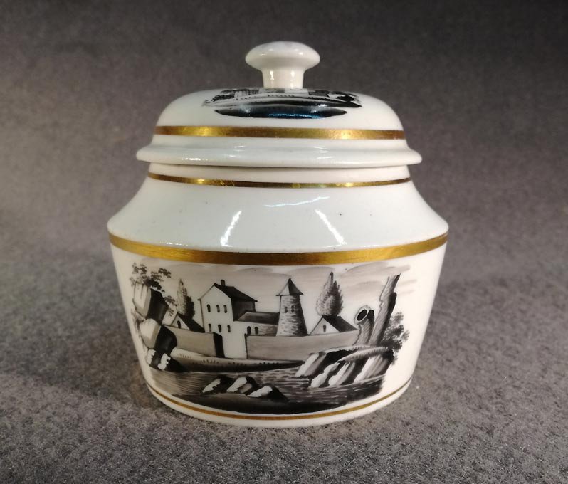 Schlaggenwald,1840, Dose m. Landschaftsmalerei, Schwarzlot, Biedermeier Deckeldose