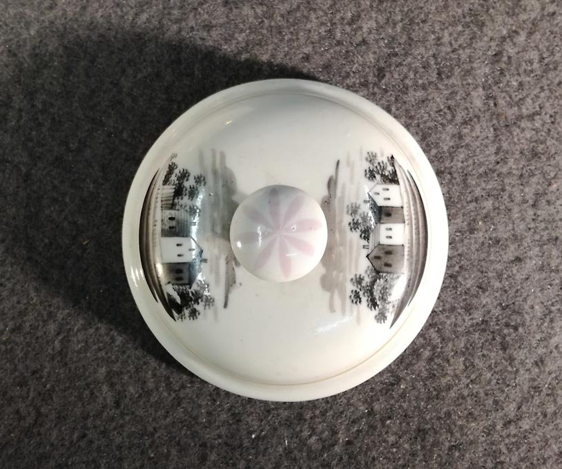 Biedermeier Deckeldose um 1840, Schlaggenwald. Schwarzlotmalerei, Landschaft mit Gebäuden.