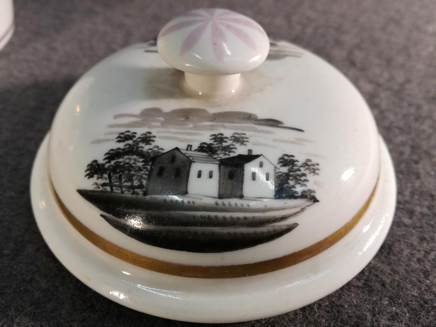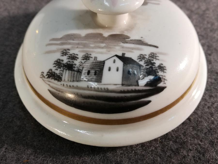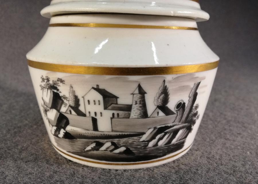 Landschaftsdarstellung auf der Dose und 2 kleinen Landschaftsszenen auf dem Deckel in Schwarzlotmalerei.