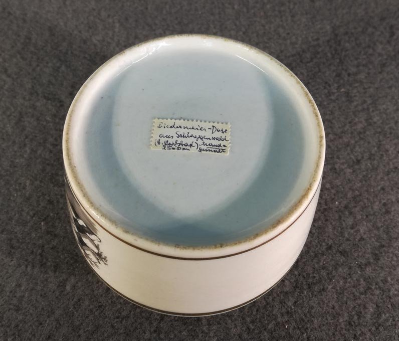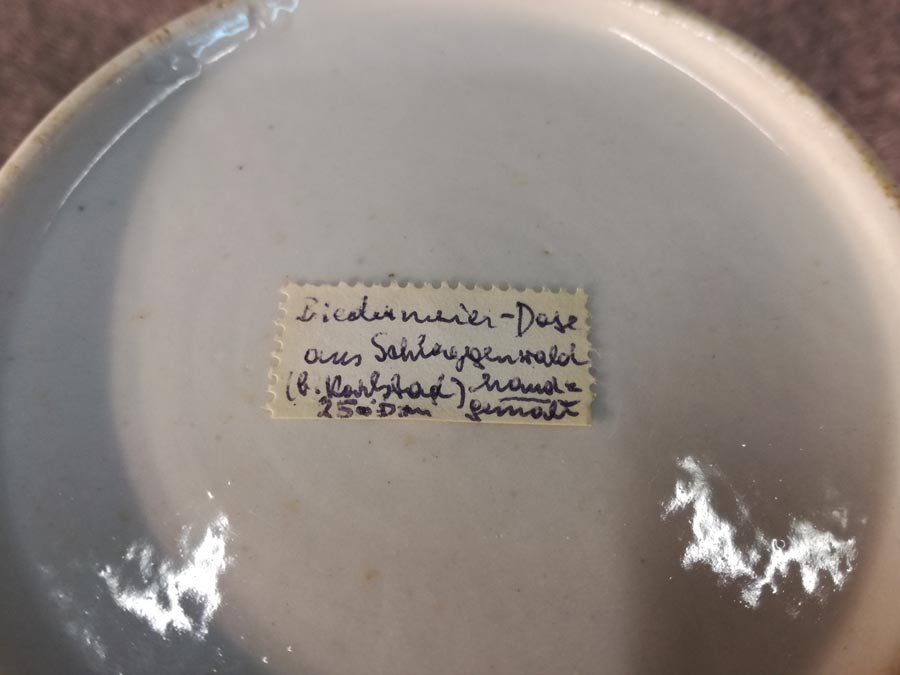 Auf dem Boden mit altem Sammleretikett handschriftl. beschriftet: "Biedermeier Dose aus Schlaggenwald handgemalt 250 DM" (diese Preise wurden früher tatsächlich bezahlt).