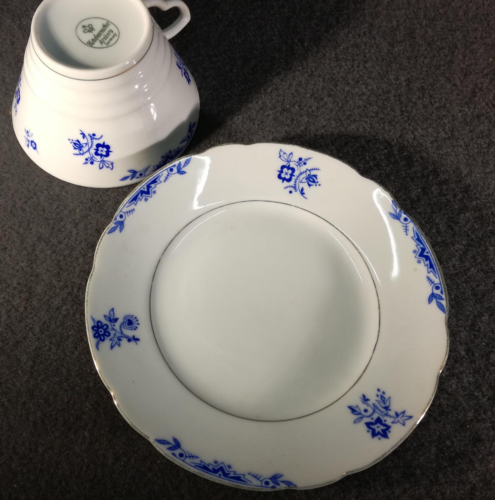 Sehr guter Zustand, ohne Beschädigungen. Keine Risse, Chips oder Abplatzer. In der Tasse eine kleine Glasurunreinheit, herstellungsbedingt, unter Glasur.