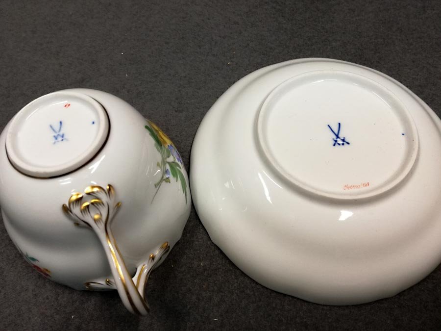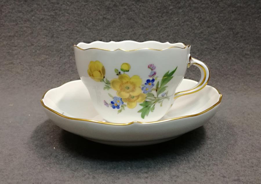Meissen, Tasse mit Untertasse. Reich gemaltes Blumenbukett mit Goldrändern und Goldapplikationen am Henkel.