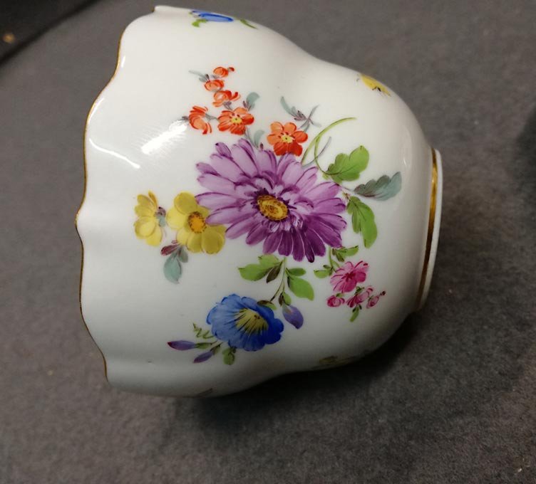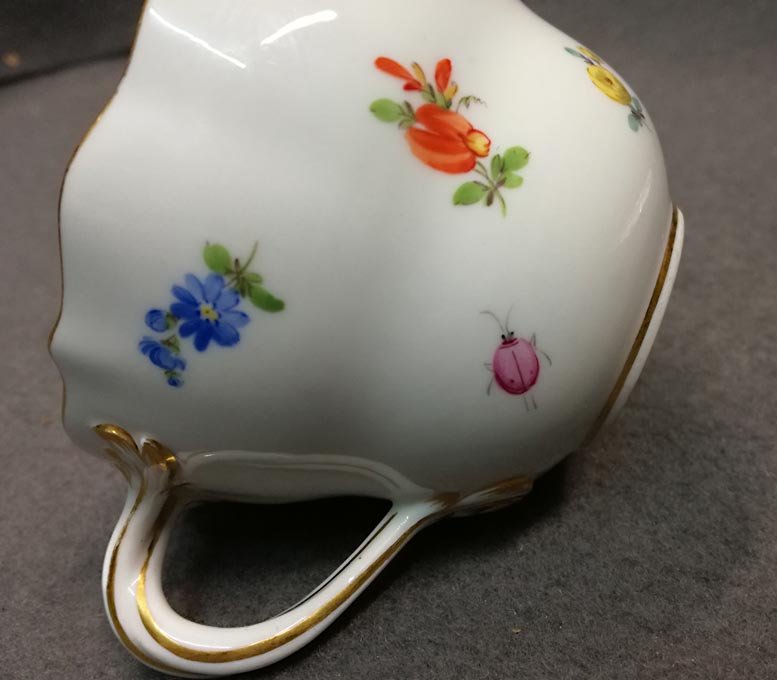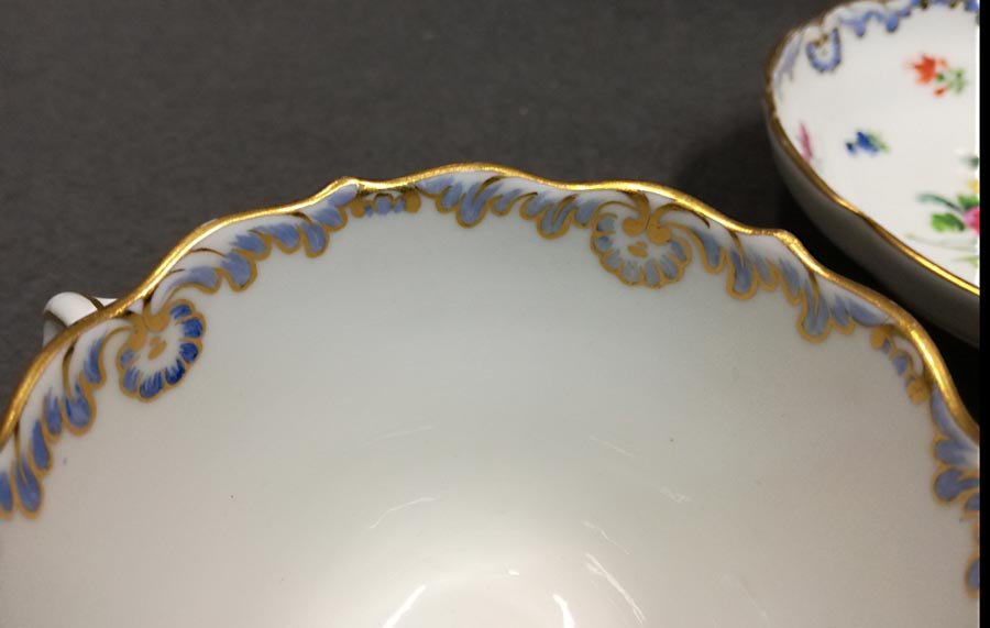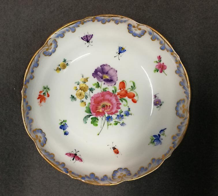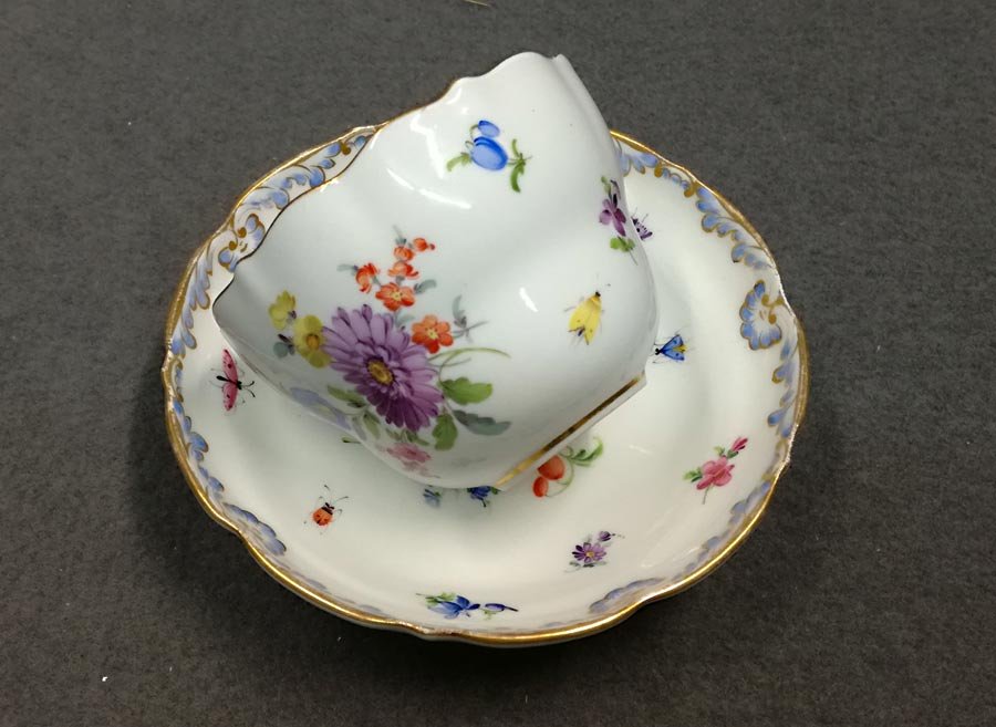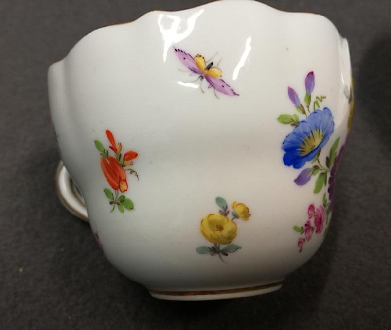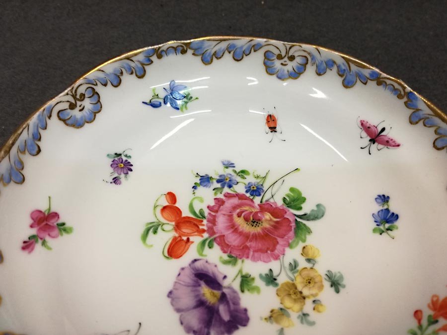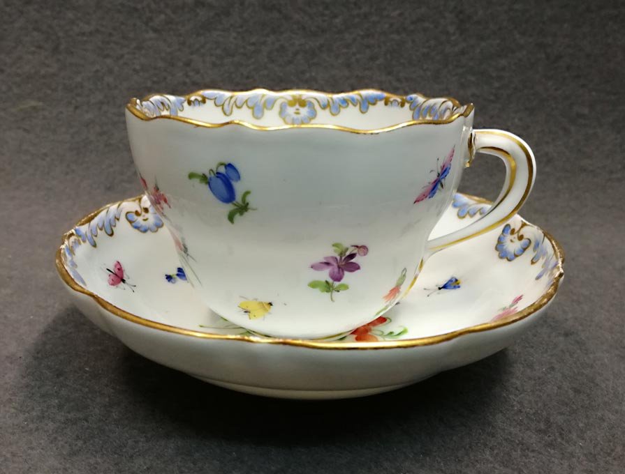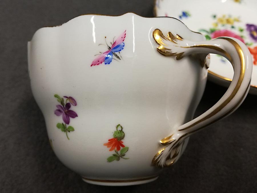 Meissen um 1880, Kaffeegedeck zweiteilig bestehend aus Tasse und Unterteller. Blumen- und Insektenmalerei mit Gold und Randbordüre. Reiches Blumenbukett mit Streublümchen und Insekten. Astartiger Henkel ebenfalls goldverziert.