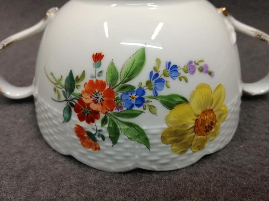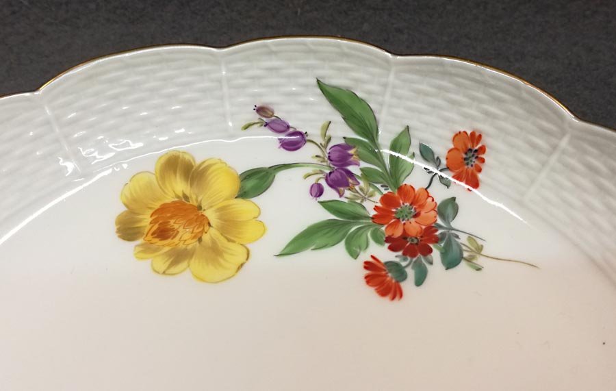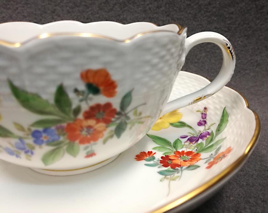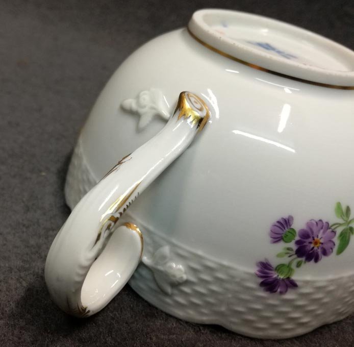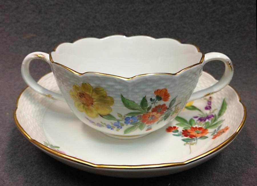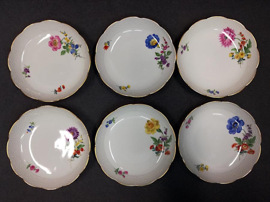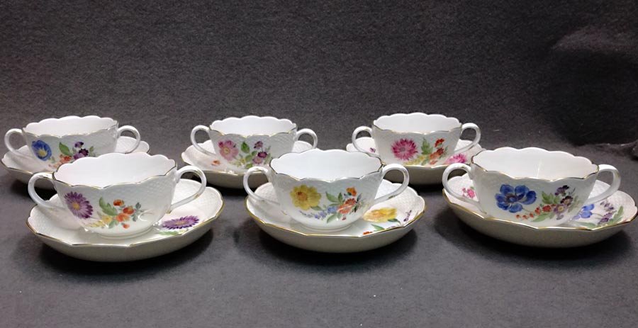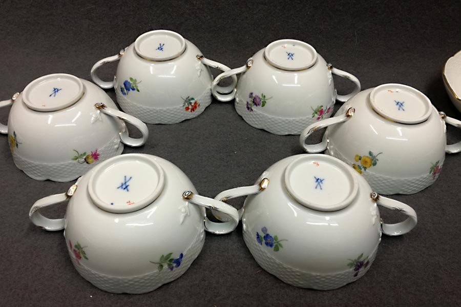 Manufaktur Meissen, sechs Suppentassen mit Untertassen. Tassen und Unterteller mit Ozier Reliefrand (Weidenkorb-Rand). Aufwändige Blumenmalerei. Ränder und Henkel mit Goldzier.