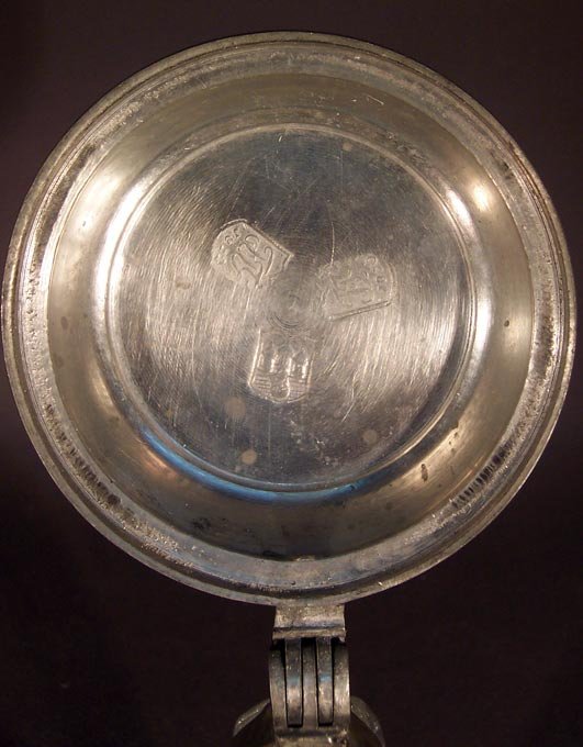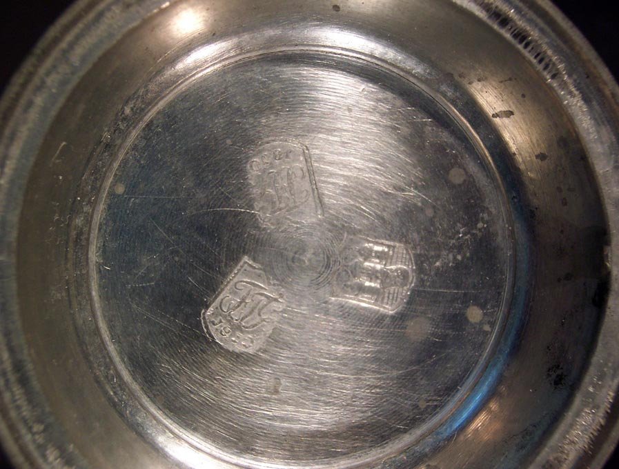 Der Zinndeckel monogramiert mit "C F F" (C? mglw.auch G) und datiert "1824".