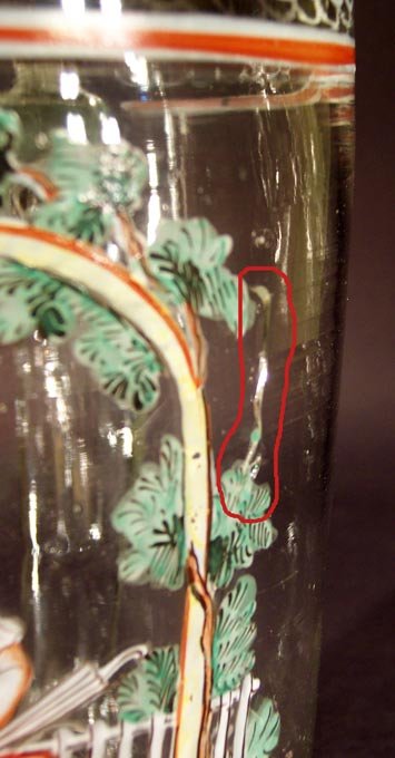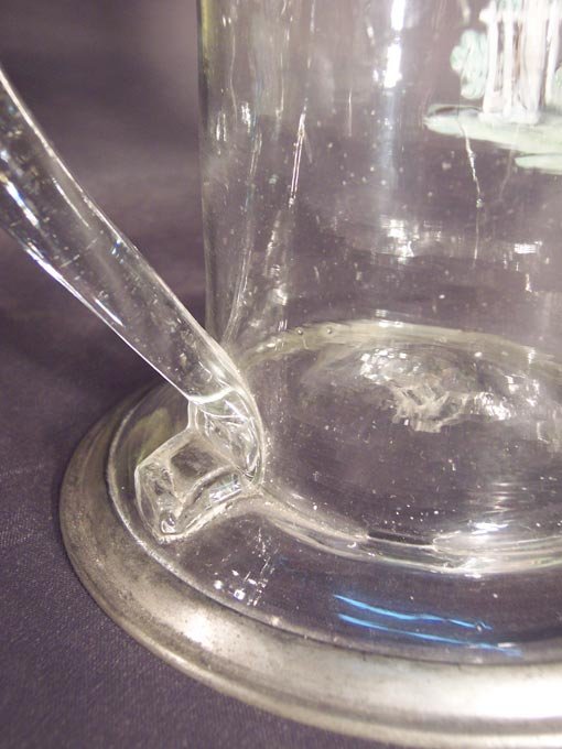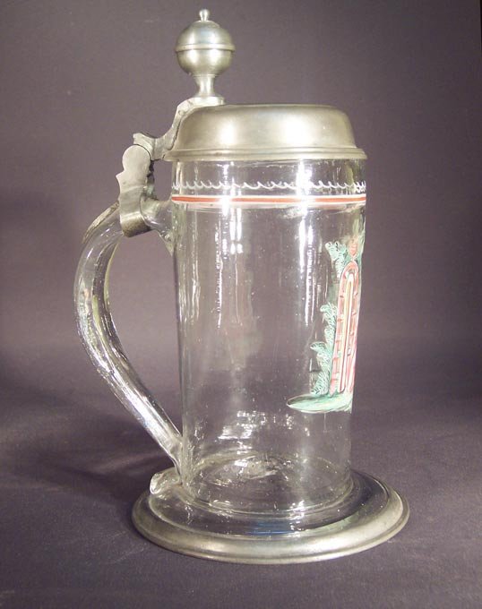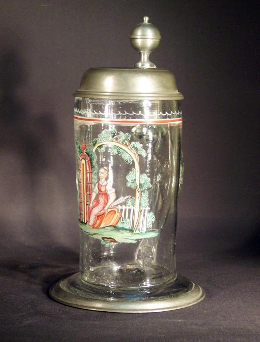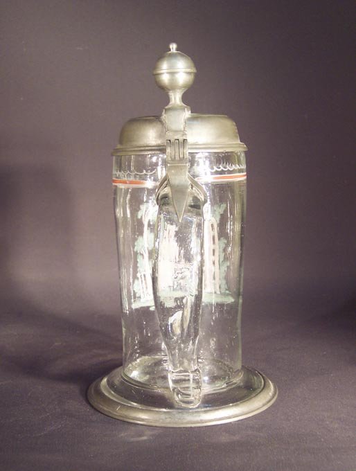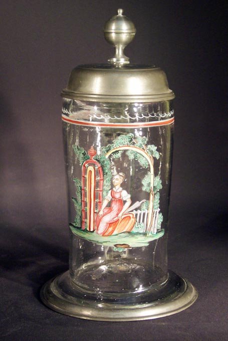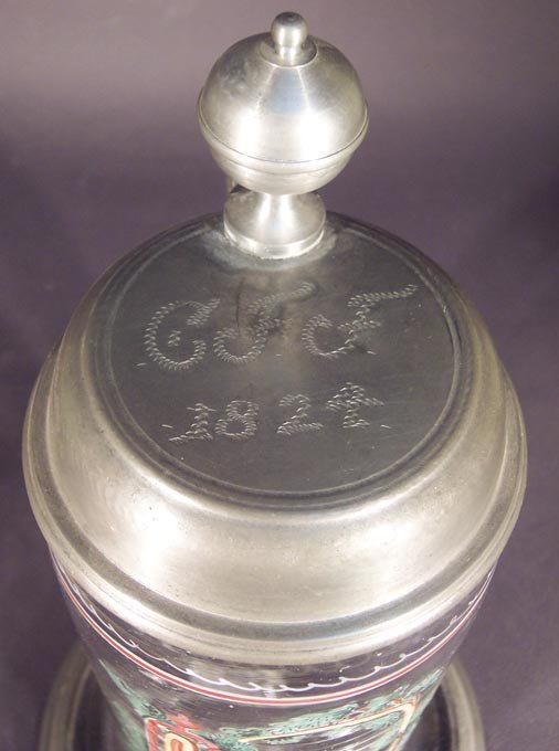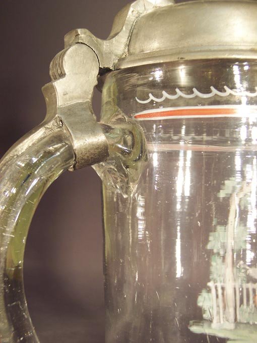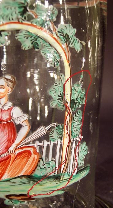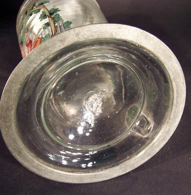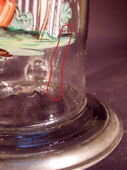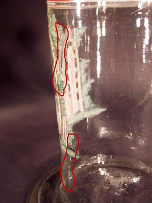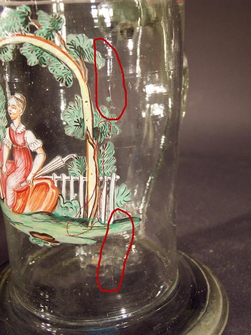 Abrissglas, im Boden ist der Abriss zu erkennen. Zinndeckel und Standring original. Zinndeckel innen mit Meistermarken. Die Emaillemalerei ist nicht beschädigt oder berieben. An den Henkelansätzen sind keine Spannungsrisse im Glas, diese sind in Ordnung. Zwei Spannungsrisse im Glaskörper rechts neben der bzw. in der Malerei. Sie gehen nicht komplett durch den Glaskörper, laufen nicht bis zu Rand, unaffällig. (siehe markierte Fotos). Keine Chips oder Abschläge oder sonstige Beschädigungen.