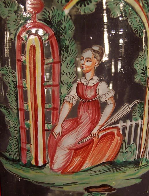 Henkelkrug mit Zinndeckel, Zinnstandring und Darstellung in Emaille. Dargestellung einer Dame im Garten mit Schirm in der Hand.
