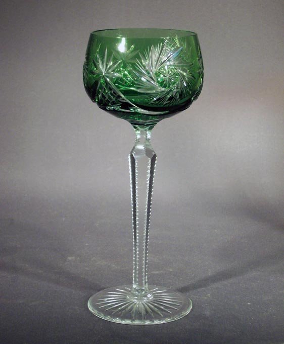 Weinrömer;  Kuppa überfangen und geschliffen. Stiel facettiert und gekerbt. Fuß mit Kerbschliff.