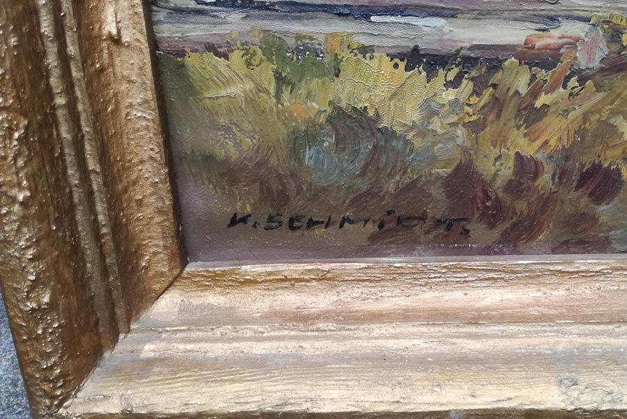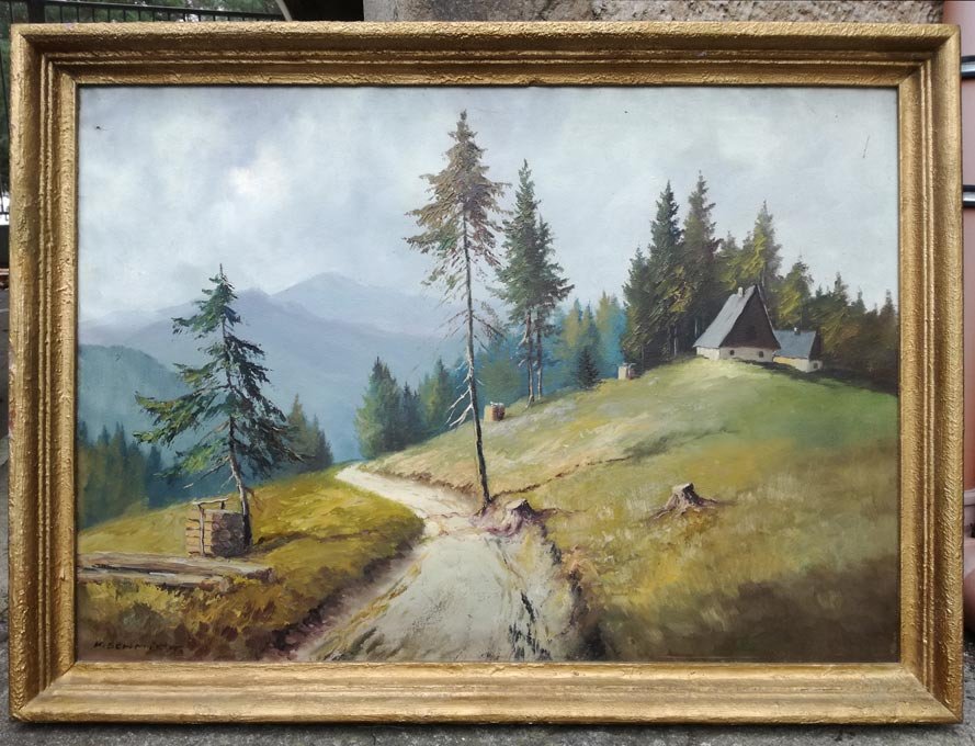 Großes Ölgemälde. Landschaft, bewaldete Berglandschaft mit Haus. Ölgemälde auf Leinwand gemalt. Signiert. Rahmen-Außenmaß: H. 80 cm, B. 109 cm. Der Rahmen mit kleinen Beschädigungen.