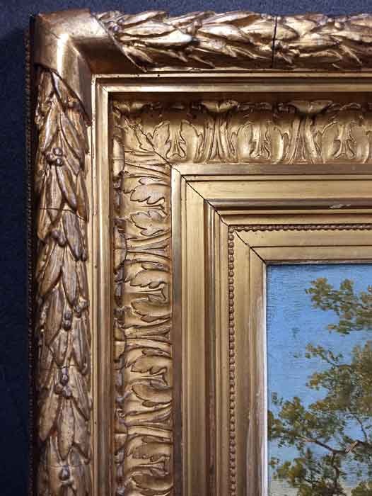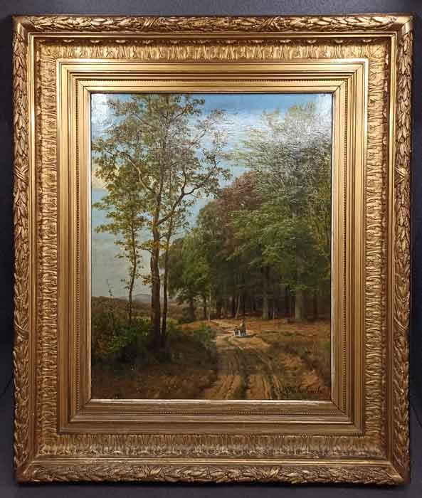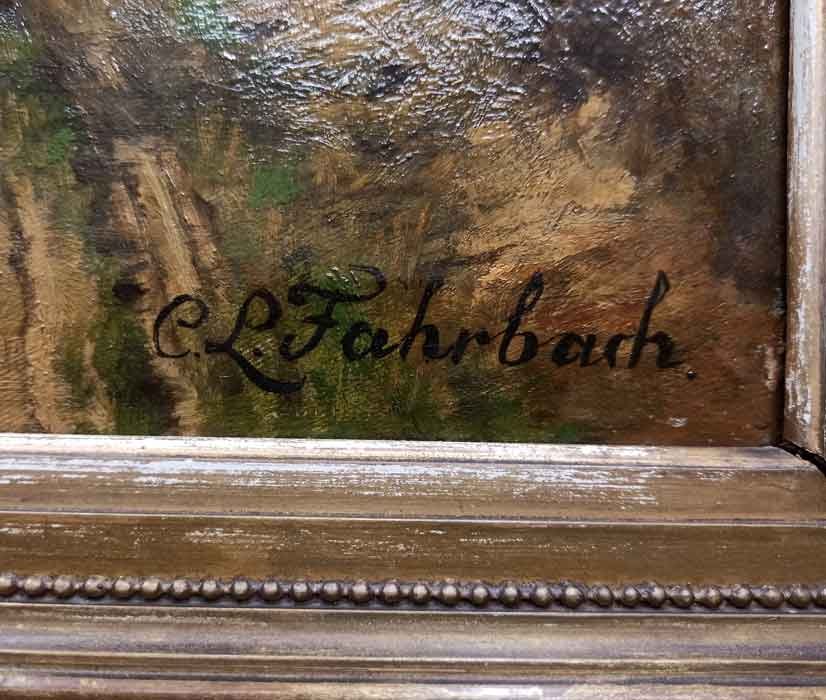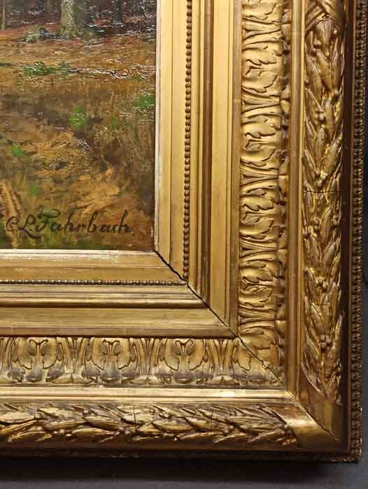 Reserviert!  Karl Ludwig Fahrbach; *10. Dez.1835 Heidelberg; † 20.Jan.1902 Düsseldorf. Waldlandschaft, Spaziergänger im Wald. Öl auf Leinwand. Re. unten signiert "C.L.Fahrbach". Vergoldeter Stuckrahmen. Bild: 65 cm x 50 cm, Rahmen: 95 cm x 81 cm.