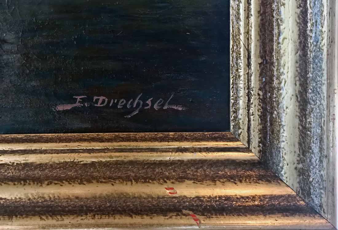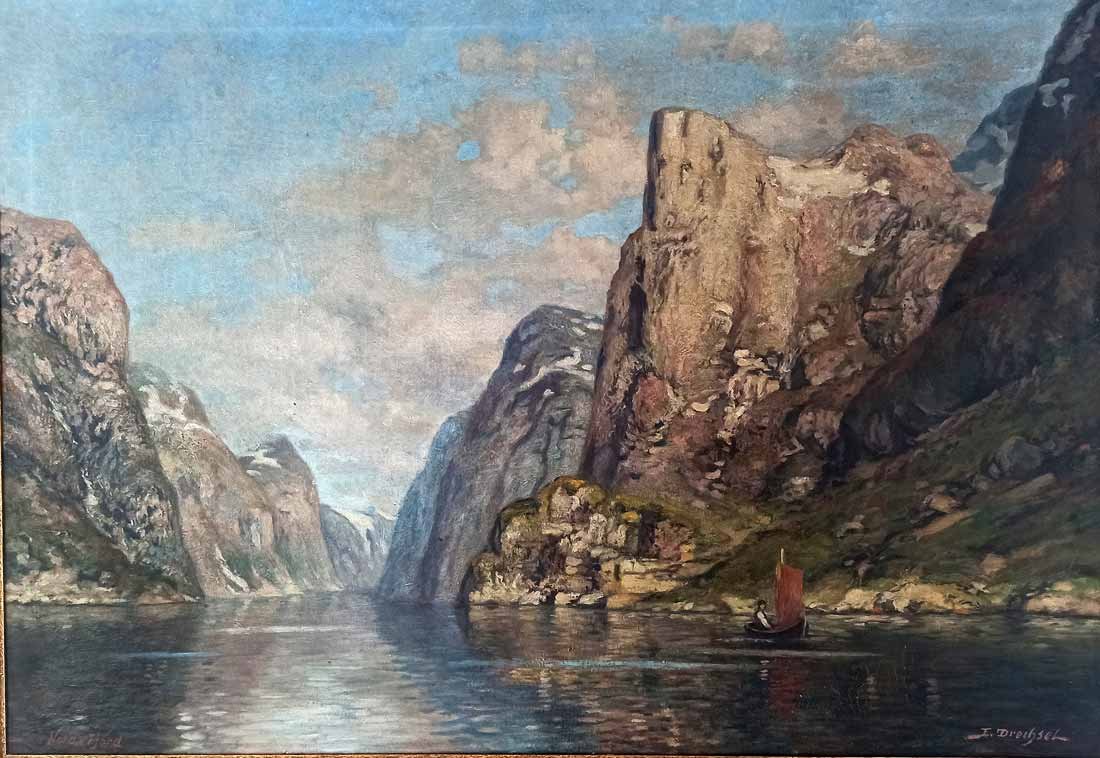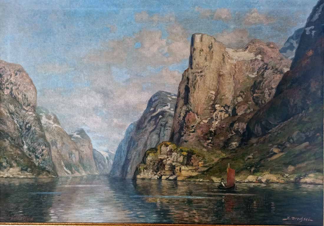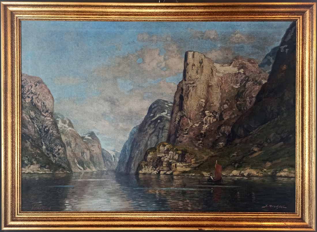 Maße; 69 x 99 cm (Bild),  81 x 111 (Rahmen), Re.u. sign.  E. Drechsel und li.u. bezeichent "Nord-Fjord".