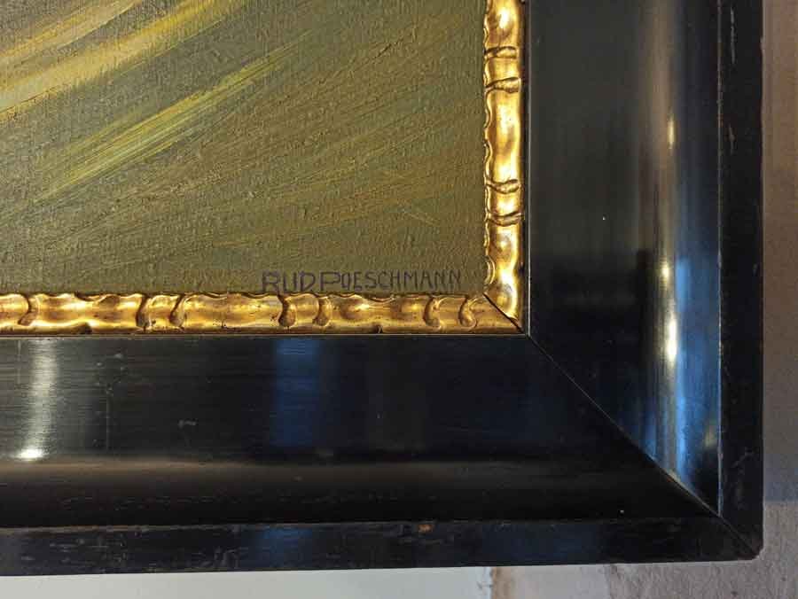"Rudolf Poeschmann; * 1878 Plauen i.V. † 1954 Dresden. Maler in Dresden. Schüler von J.Herterich und G.Knebl an der Münchner Kunstakademie sowie bei Carl Bantzer und Gotthardt Kuehl an der Dresdner Kunstakademie. Wandgem. im Rathaus Plauen; Ölbilder im Ständehaus Dresden und in den Museen zu Bautzen, Dresden, Plauen i.V. u. Zwickau.