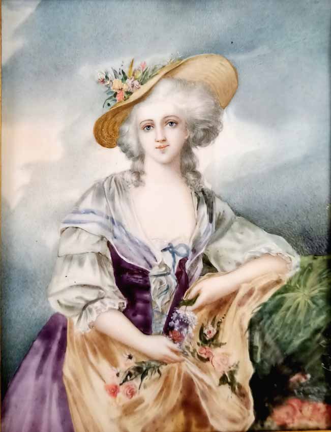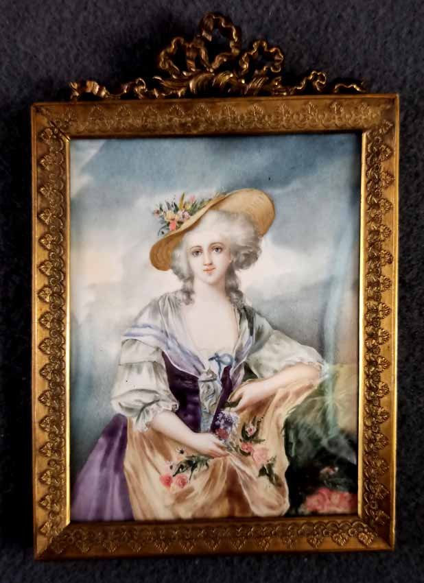 Fein gemaltes Frauenbildnis, Madam Elisabeth. Miniaturmalerei, Gouache auf (Elfen-) Bein, Mitte 19.Jh.. In fein verziertem Messingrahmen hinter gewölbten Glas.