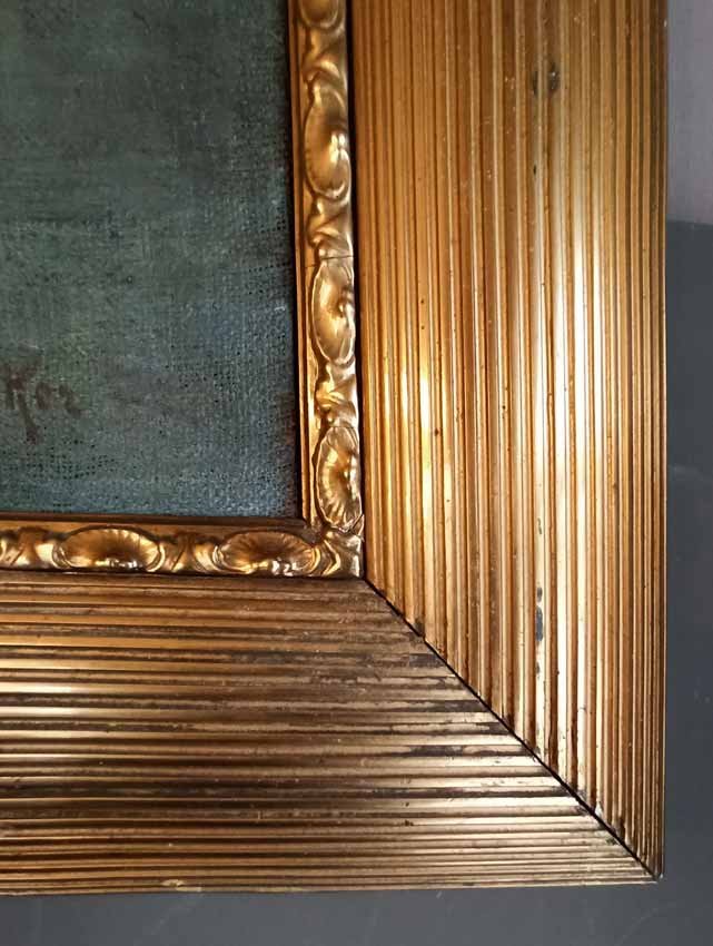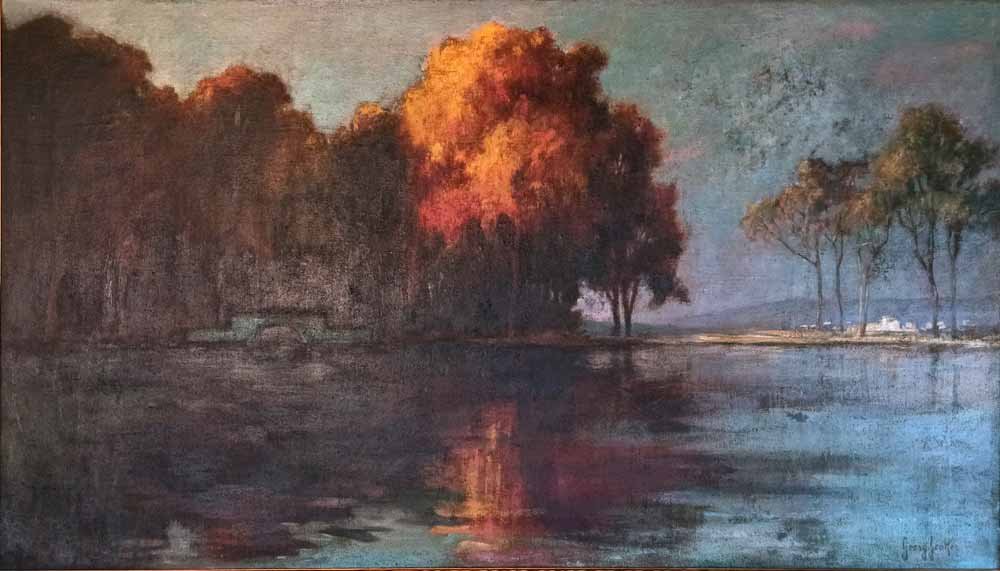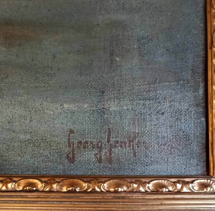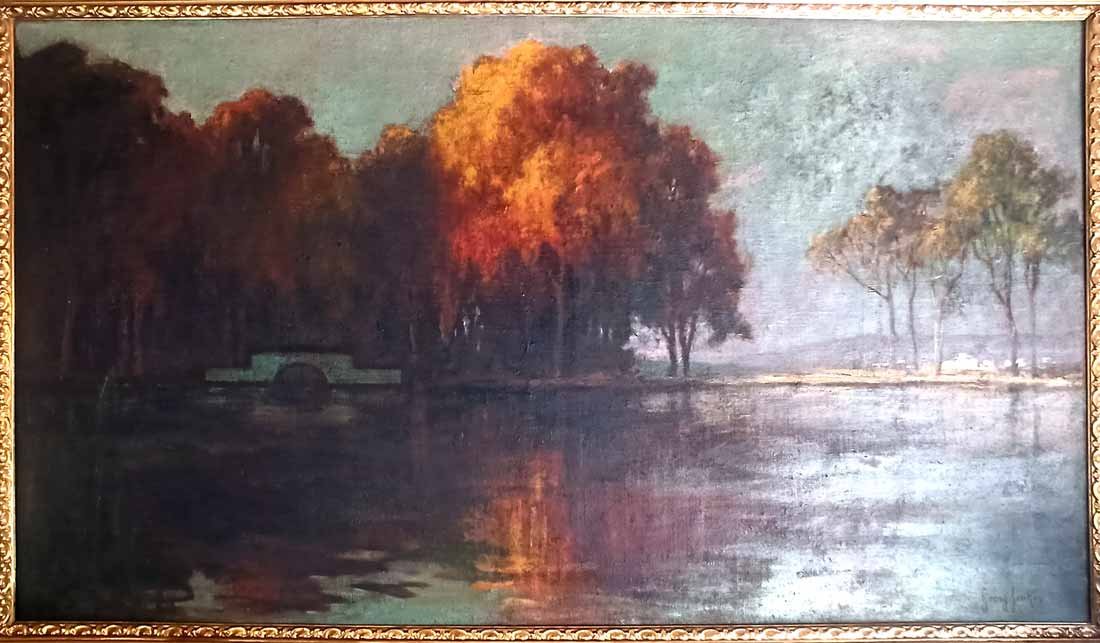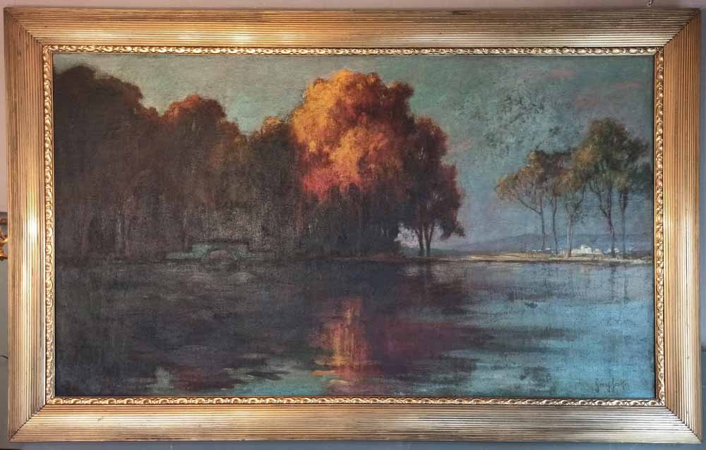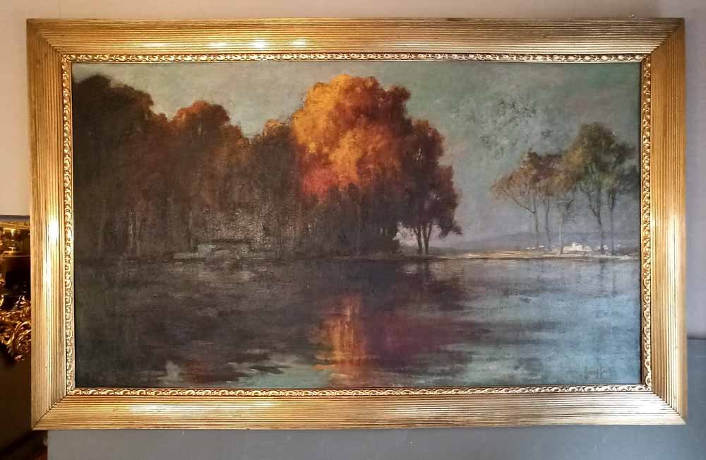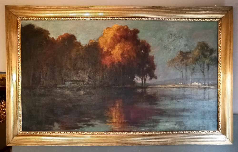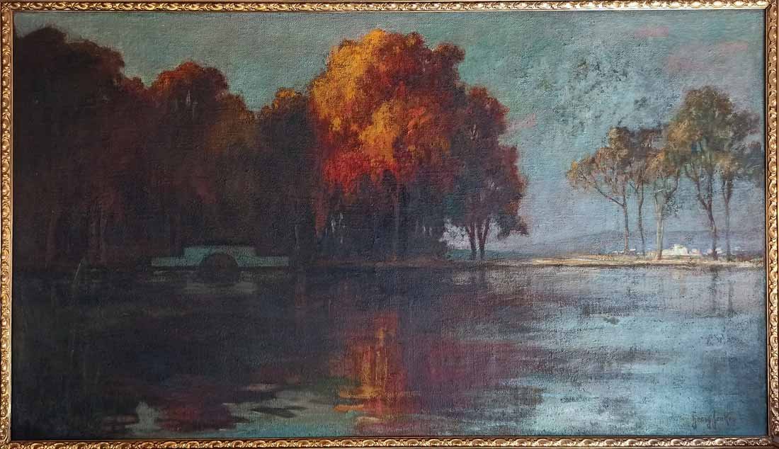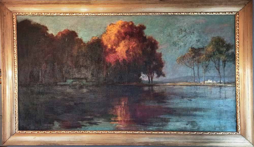Zenker, Oskar Georg, (*1869 +1933) Großes Landschftsgemälde mit Blick über einen See auf Bewaldung und eine entfernte Stadt. Dekoratives, großes Gemälde in breiter Goldleiste. B.174/200 cm, H. 94/120 cm.  Kräftige Malerei auf grober Leinwand. Re unten signiert Georg Zenker. I.O. allerdings etwas Restaurierungs-/Reinigungsbedürftig teilw. gedunkelt.  (Die Fotos hier mit Spiegelungen und Farbuntreue.)