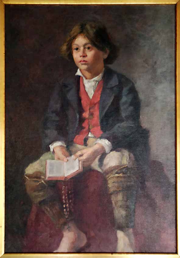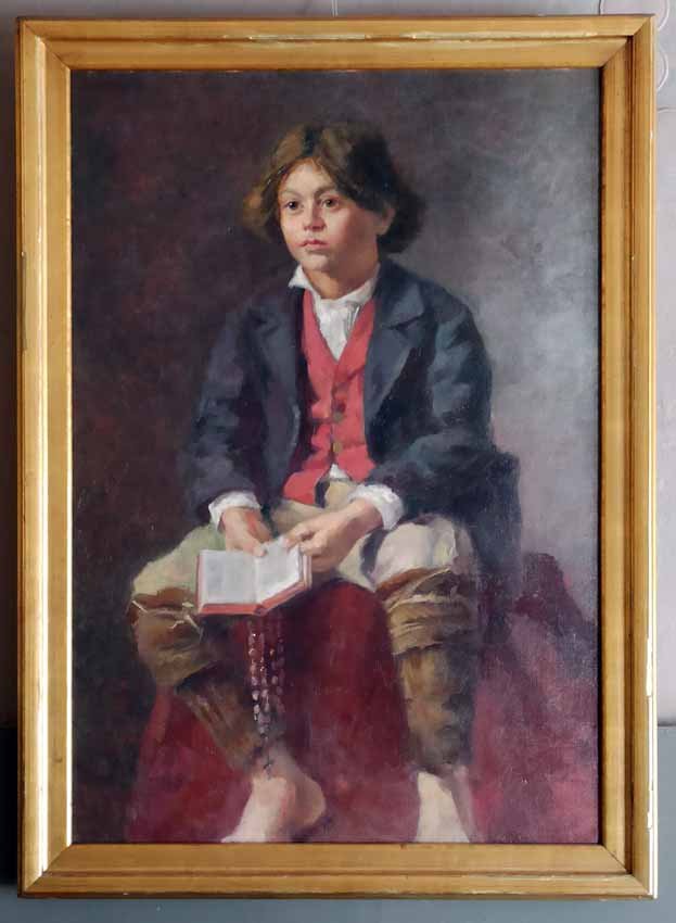 Georg Zenker (*1869 Leipzig * 1933 Bg. Stargard), "Sitzender Knabe mit Buch". Öl auf Leinwand diese auf Pappe doubliert. Rechtsseitig sign. "Georg Zenker" und undeutl. datiert ?96?. H. 96/109 cm, B. 65/78 cm