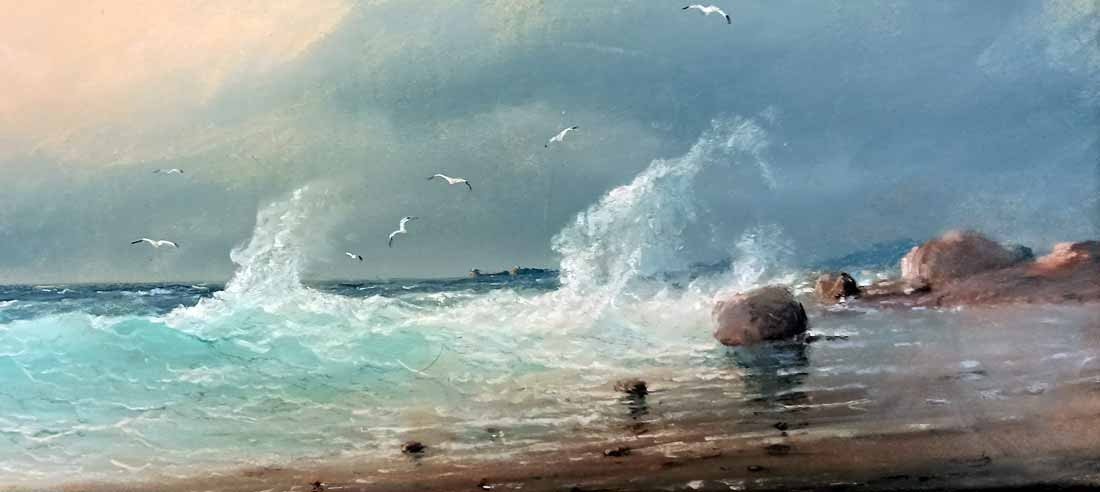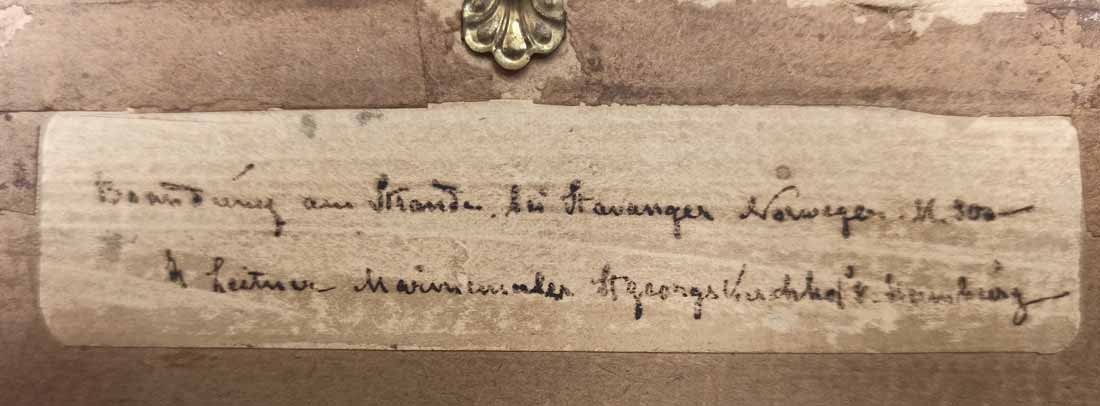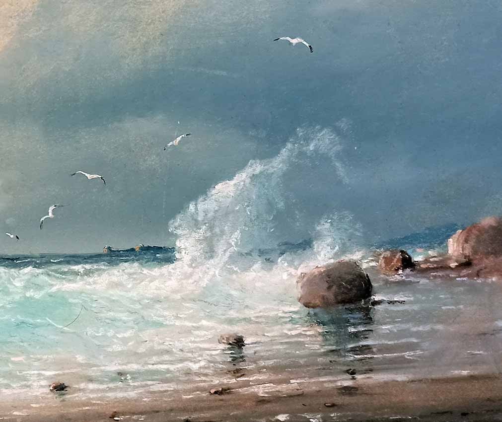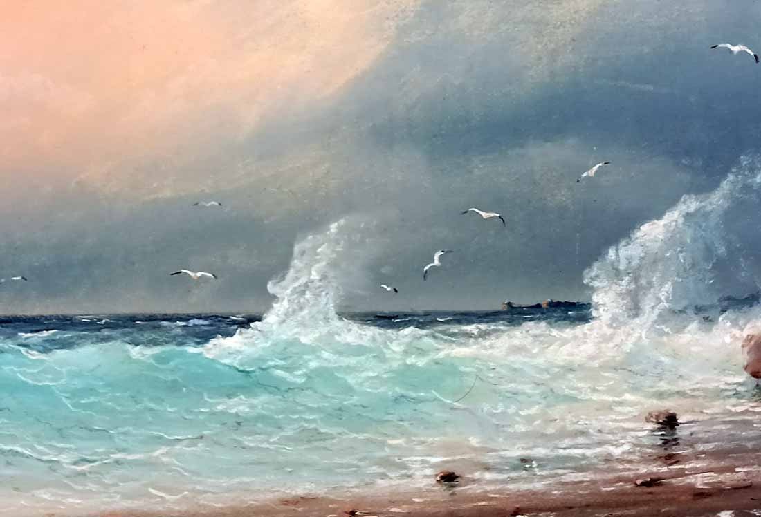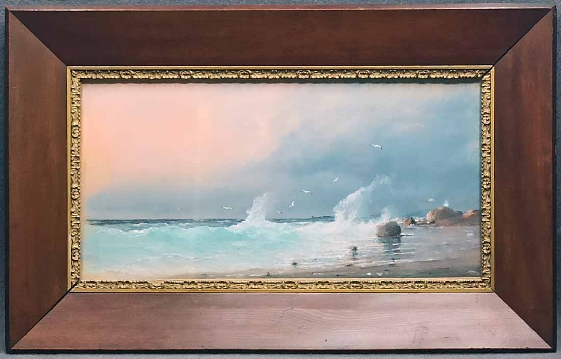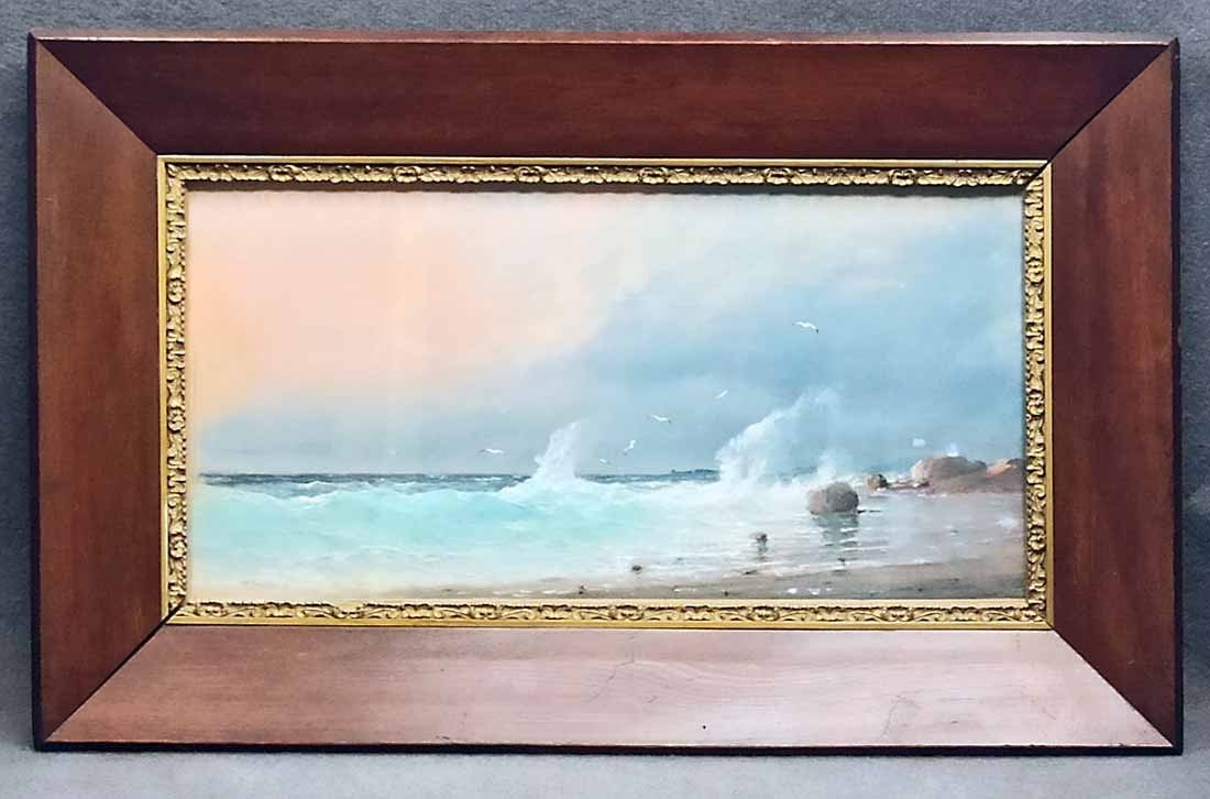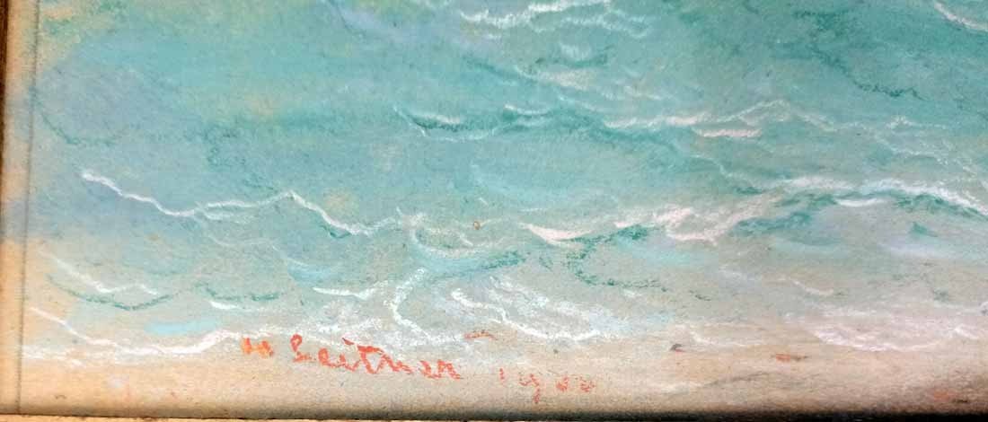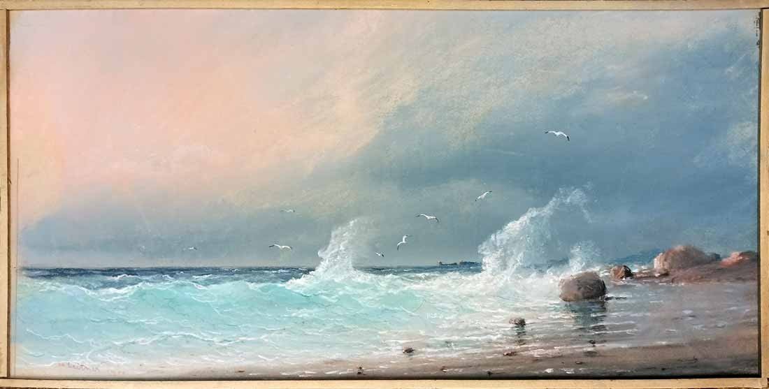 Leitner, Heinrich , Brandung am Strande bei Stavanger, Norwegen. Pastell, Lebhafte Brandung mit Seevögeln im Abendrot. B. 52/70 cm, H. 26/44 cm. Li.u. sign.: H. Leitner und dat.:1900. Rs. Klebeetikett hanschriftlich mit Ortsbeschreibung und weiteren Informationen.